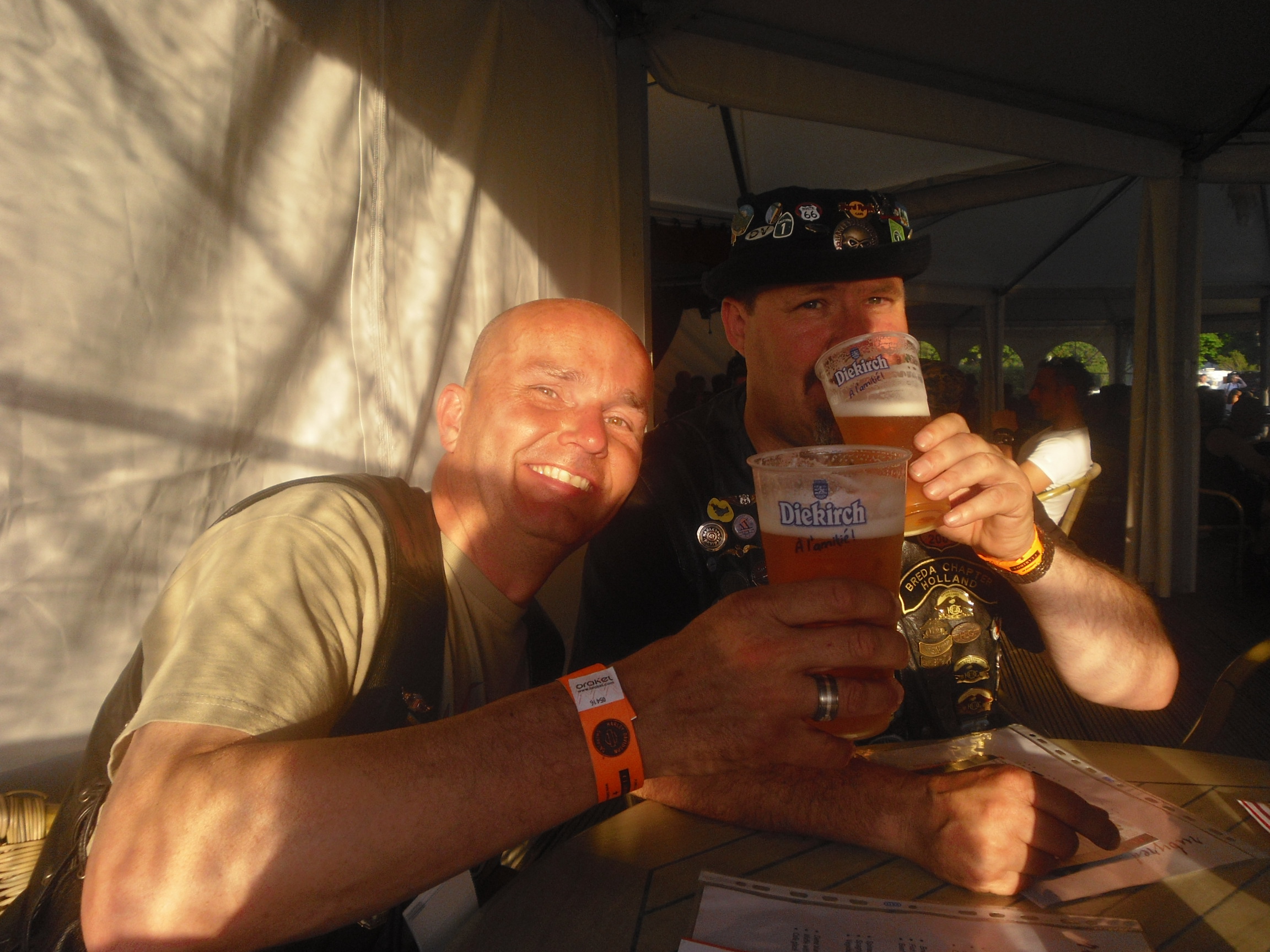 ’s Avonds speelde alweer een gave band en we zaten in het gezel-lige-schap van Daan & Annie en een aantal Belgische HOG-leden. Hilariteit alom. Na twee rode wijntjes kon ik dan eindelijk een paar uur slapen, tot een uitgelaten gezelschap weer in de tentjes naast ons arriveerde. Het was na drieën en ik was wakker. Maar weer een sanitaire stop en verder slapen tot 7 uur. We wilden namelijk vóór de parade al van de camping af zijn om de reis naar huis te aanvaarden.