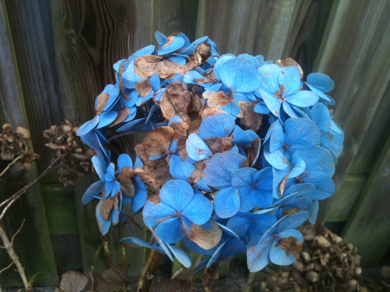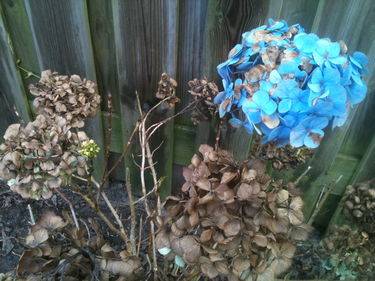 Felblauwe bol van de zomer, winterse verdorde bladeren en een nieuwe knop. Drie seizoenen binnen één hortensia!