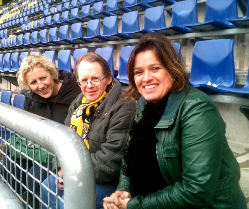 Tijdens de presentatie valt onze Simon in slaap, overmand door alle nieuwe indrukken. En broodjes. Dan gaan we via een smalle gang naar de tribunes. Voetje voor voetje schuifelt Simon mee, zijn hand stevig om de mijne gekneld, aan de andere kant innig gearmd met Monique. Op een stoel kijkt hij genietend om zich heen. We leren hem het NAC clublied en houden ons in bij de kleurrijkere taal. Dan volgt een korte rondleiding en verlaat Simon wat later het stadion met een echte NAC-bal, stil glunderend. Het is geweldig om hem zo gelukkig te zien.
