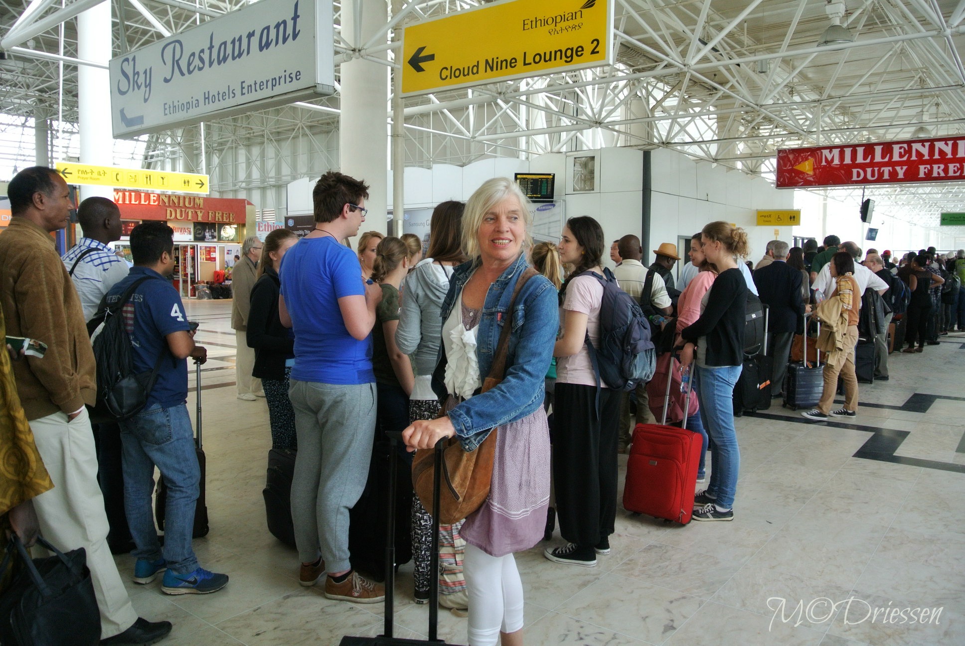 De tijd in Brussel vliegt voorbij in de bonte melange van 42 Malawigangers, stoere vaders en soms betraande moeders. Nog even een hapje eten – de panini met omelet en bacon smaakt bijzonder goed – en dan naar de douane. Deze blijkt een lichtelijke hindernis te zijn voor Agnes. Boosdoener: haar haarspeld. Na achterlating van een flesje aceton en een bijna lege fles zonnebrand mag ook zij doorlopen.