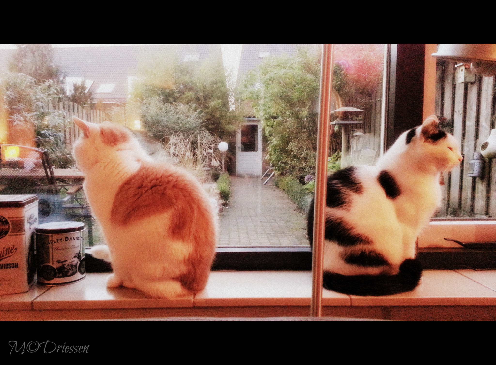 Bandit en Smokey, moe van het zoeken, houden toch een half oog op de tuin.