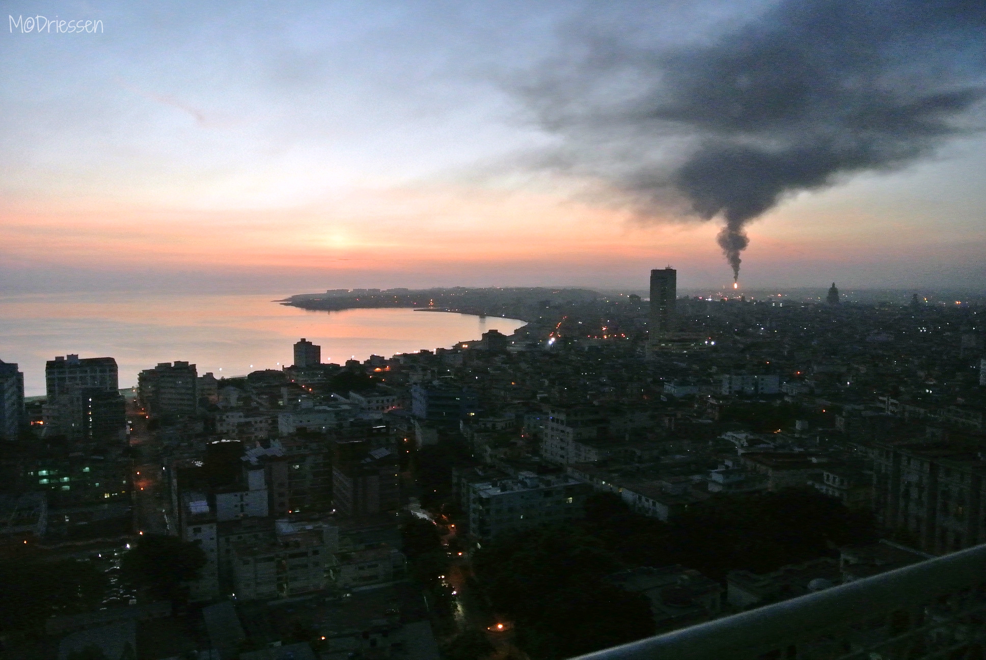 Drie agencies later hebben we dan eindelijk de juiste balie te pakken, waar het Spaans en een beetje Engels ons om de oren vliegt. De medewerker brengt ons naar een aftandse taxi met een zeer zwijgzame chauffeur. Pas als zijn gsm voor de derde keer een zeer aanstekelijk deuntje als beltoon laat horen, schieten we samen in de lach. Het Habana Libre doemt boven ons op en een krakende lift brengt ons naar de zeventiende verdieping, kamer zeven. De kamer heeft gelukkig airco; de vochtige klamme hitte is zelfs in de avond nog aanwezig.