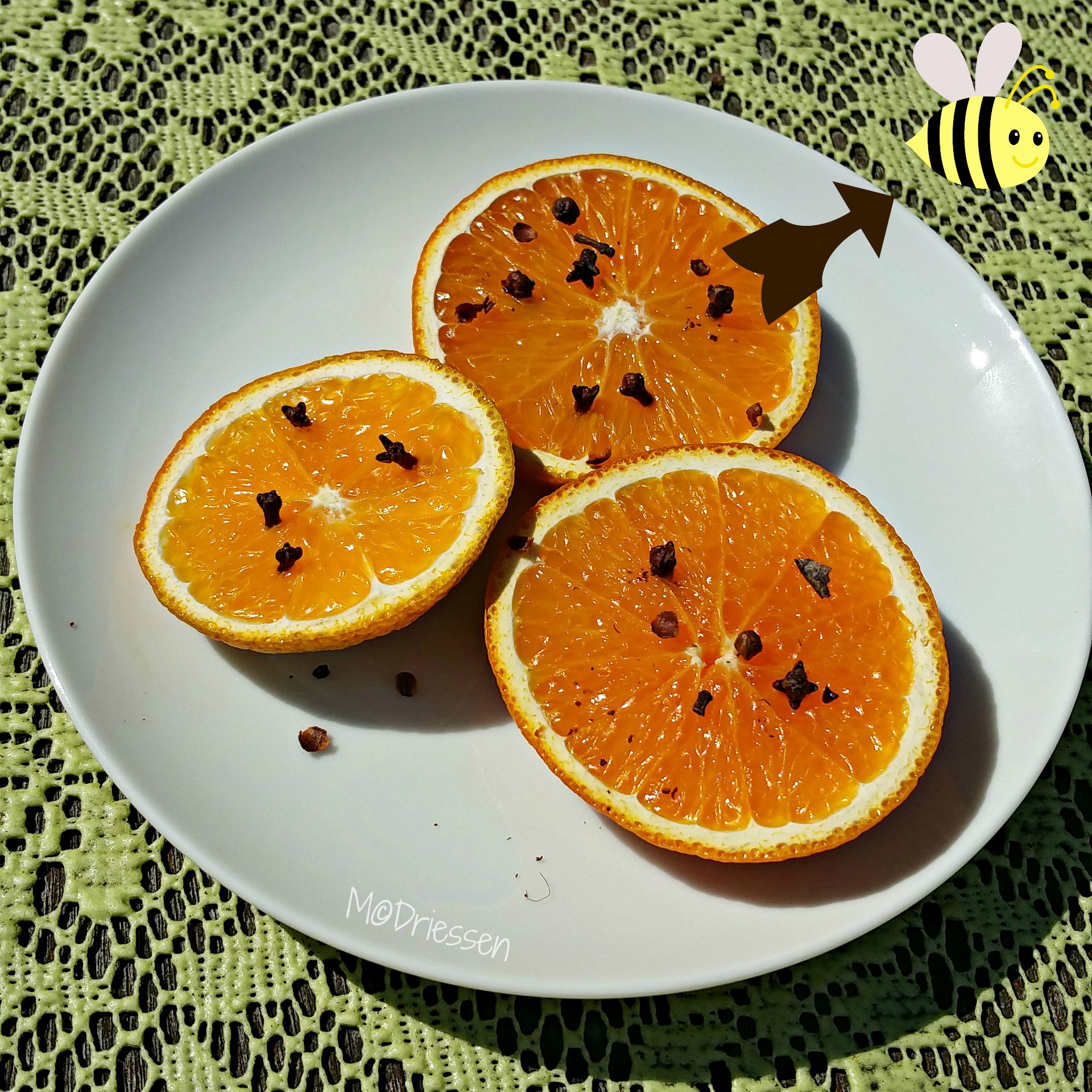 - snijd een citroen/sinaasappel in schijfjes, druk daar kruidnagels in en zet het schaaltje bij je op tafel;