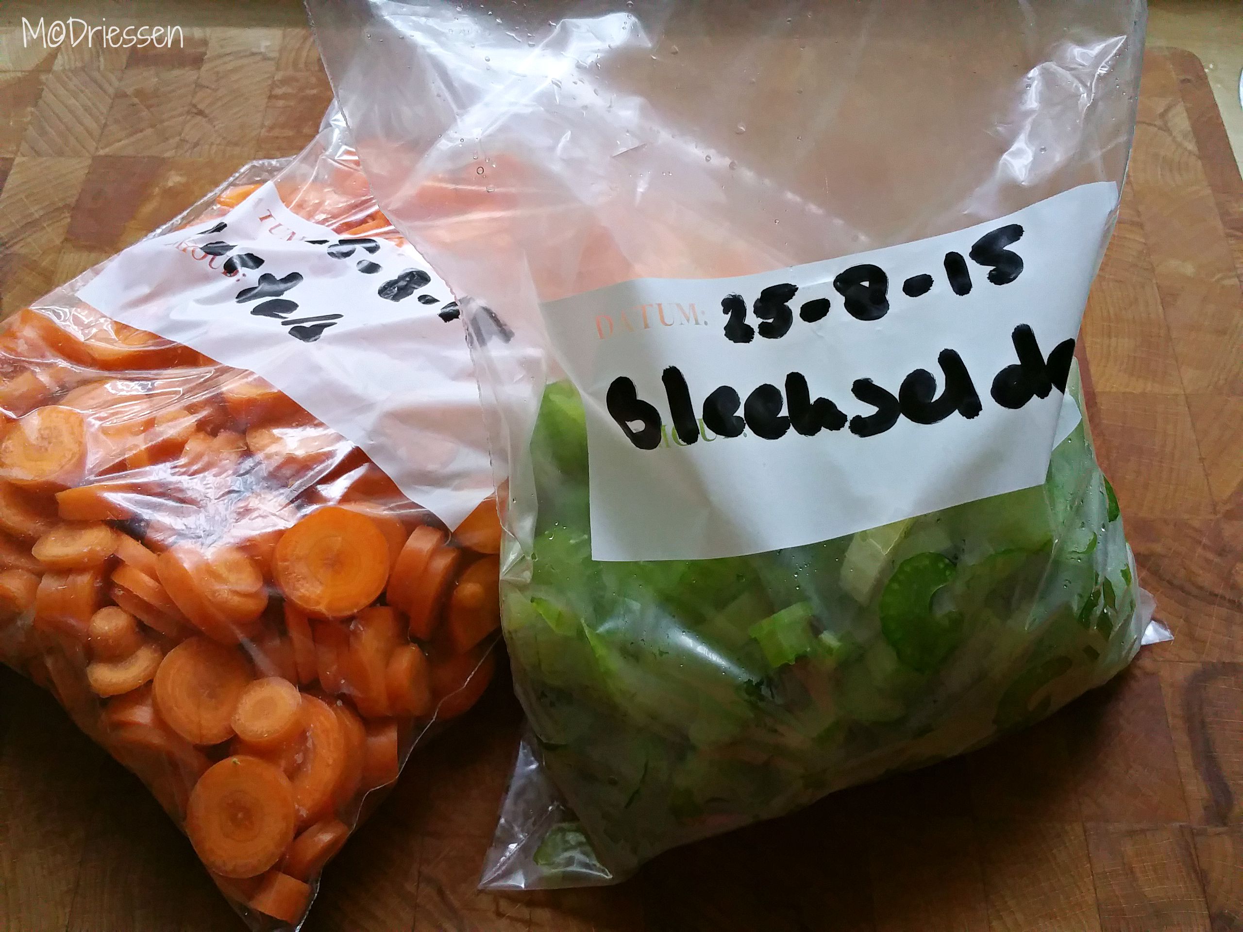 Vaak maak ik groene smoothies en salades voor ontbijt en lunch, en daarvoor gebruik ik onder andere bleekselderij en bospeen. Stronk en bos nemen echter veel ruimte in de koelkast in en vallen er bovendien op gezette tijden spontaan uit. Nu heb ik iets nieuws verzonnen: na aankoop maak ik de bleekselderij schoon en snijd hem in kleine stukjes die ik vervolgens twee minuten blancheer. Laten afkoelen en in de diepvries. Hetzelfde doe ik met de wortels, maar die gaan rauw de diepvries in. Handig en snel in de ochtend: je brokkelt de groente die je nodig hebt af en stopt de rest terug in de vriezer. Het maakt de smoothie bovendien fris en houdt je salade koel.