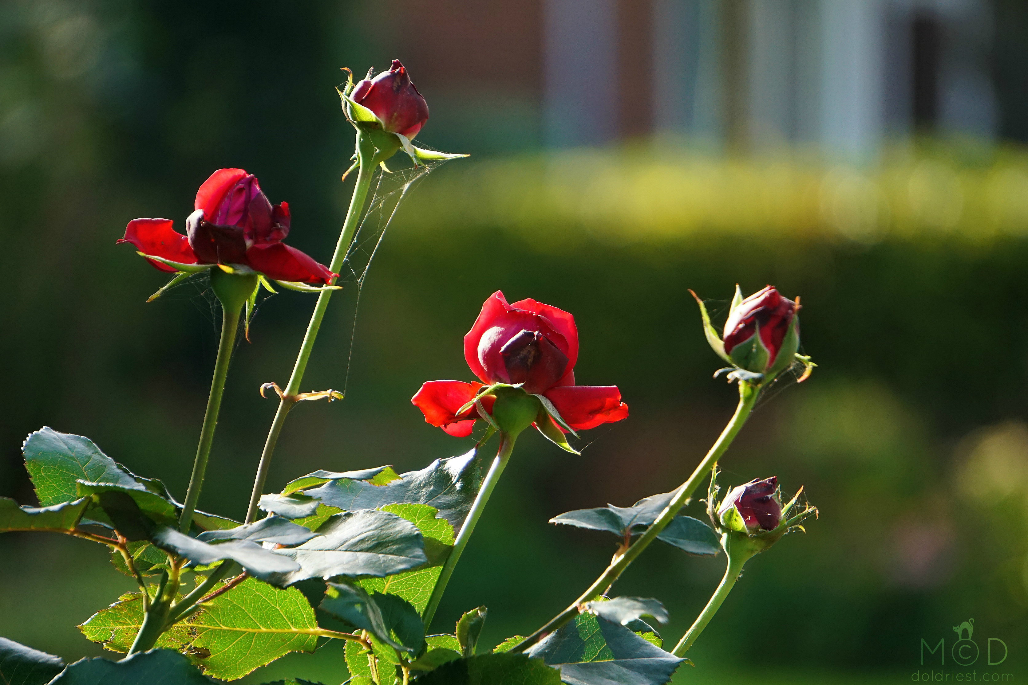 intens rood in het warme zonlicht … heel mooi, teder én krachtig die roosjes!