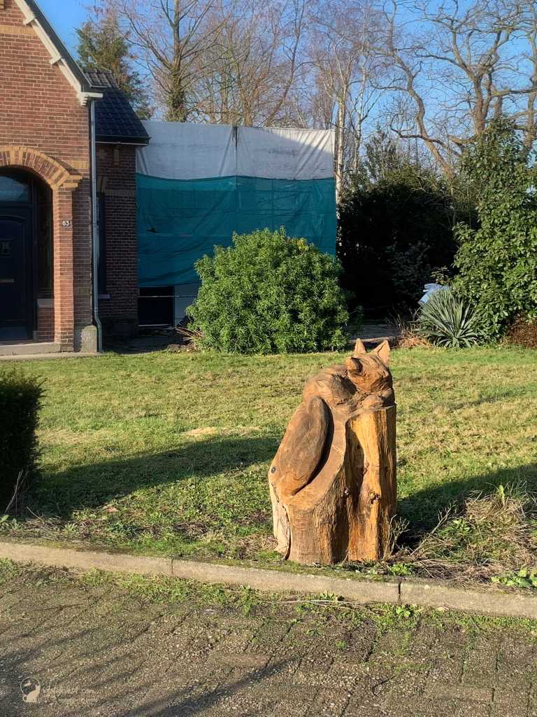 Wie zich trouwens niet aan de WeightWatchers houdt, is mijn tuinmuis. Iedere dag seilt zij ab van het muurtje en doet zich tegoed aan de pindakaas. Ze blijft zelfs zitten als ik het raam open voor Smokey. Gelukkig zie ik het knaagdier smikkelen en trek het raam met een bons voor kater’s neus weer dicht. Ik wurm me door een kiertje van de deur naar buiten en tracht de enthousiaste kater tegen te houden. Muis heeft ons in de gaten en laat zich met een plof naar beneden vallen. Een plof! Dat beest wordt te dik. Straks roeit zij met haar pootjes op haar dikke buik vooruit, maar raken de teentjes de grond niet meer. Zover is het gelukkig nog niet. Ze draalt niet, maar schiet weg naar veiliger oorden. De kat snuffelt weemoedig op de landingsplek. Hoe lang gaat dit nog goed? Als het aan Smokey ligt niet lang, ook al heeft hij geen boventanden meer