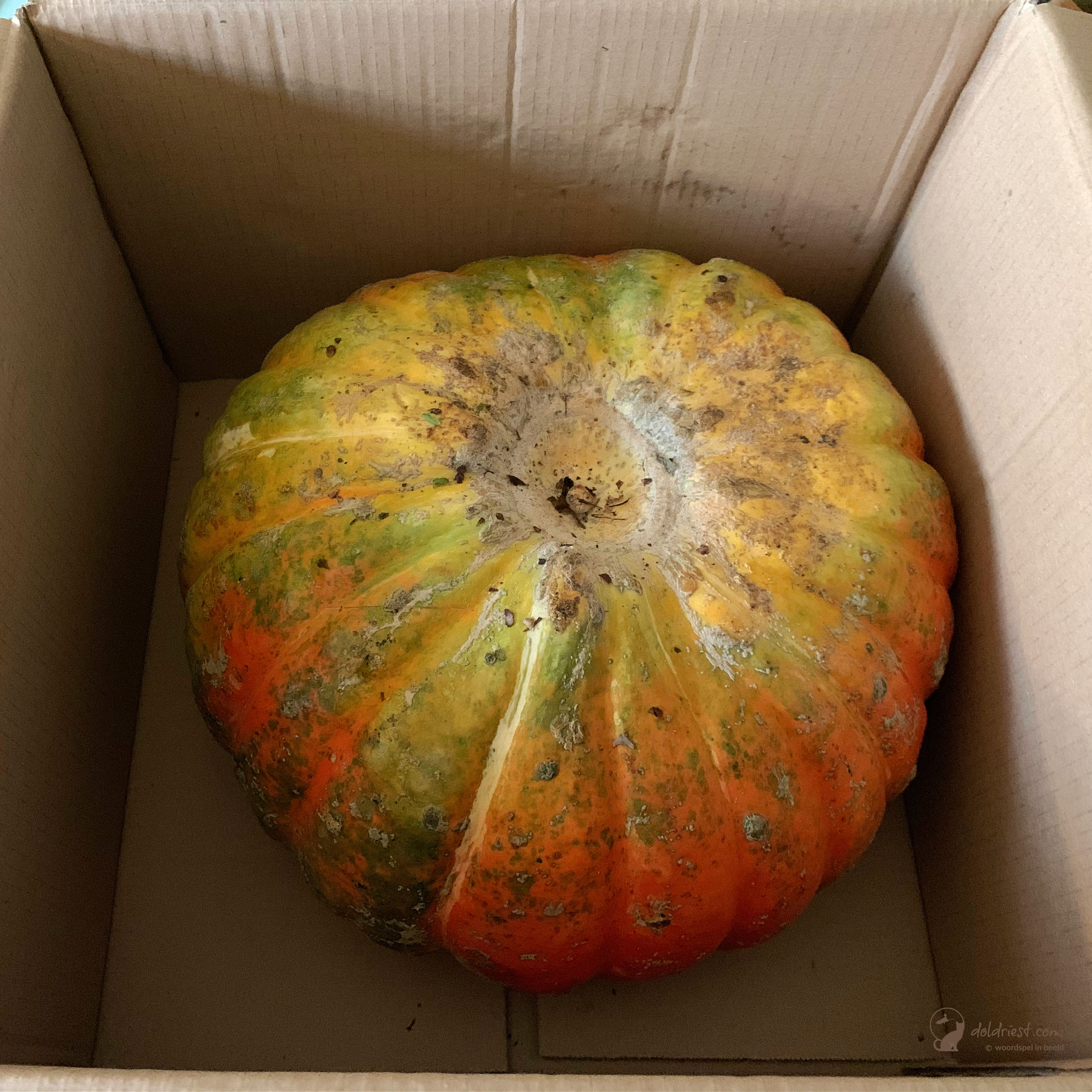 Wat later die dag wordt de tweede Boerschappen-box geleverd, de vegan versie dit keer. No way dat ik nog een keer verlekkerd naar dingen ga staren die ik toch niet mag eten en die mijn huisgenoten niet lusten. De bezorger tilt zich haast een breuk. Ik gebaar naar de deurmat, bedank hem en brul naar boven. ‘Kan iemand even een doos tillen?’ Jongste zoon rolt spierballen en zet de box op de keukentafel. Nieuwsgierig klap ik de kartonnen flappen opzij en zie een volle doos. Hè? Het raadsel is snel opgelost: onderin vult een pompoen de gehele bodem. Een pompoen voor 2 personen. Een pompoen van 35 centimeter doorsnede. Die past niet eens in mijn grootste pan.