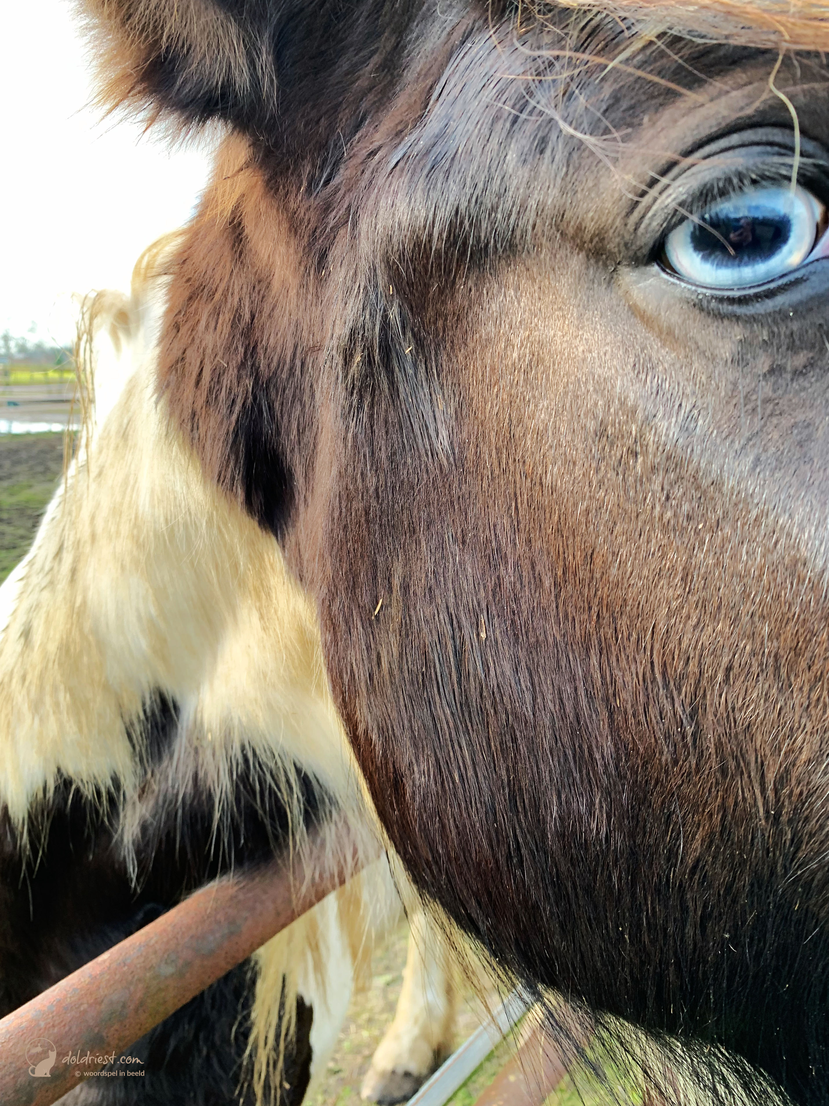 Op de laatste werkdag van de week (mijn vrije dag) zijn de wolken nog steeds lek, kapot gewaaid door de harde wind. Zoveel wind dat mijn paard het niet aandurft, bang dat ik van haar rug wordt geblazen. Ik besluit mijn eigen onderstel aan het werk te zetten en loop wat later die ochtend mijn grote ronde. Tot mijn verontwaardiging zegt de app dat het maar 3200 stappen zijn. Maak ik ze te groot, of is de ronde gekrompen? Toch maar weer het horloge gaan dragen, dat is wat guller met het aantal. Ach, who cares! Mijn neus is fris en mijn wazig blikveld verruimd. Mijn brein weet nog steeds niet door welke laag van de lenzen het in de verte moet zien. Ik sta regelmatig stil en dek om beurten mijn ogen af, train ze tot ze gaan tranen. Zie nog wat tuig op straat lopen, maar als ik dichterbij kom blijkt er een Rottweiler in te zitten. Verheugd maak ik lokkende geluidjes, maar het baasje kijkt me bevreemd aan. Doorlopen, Mar!