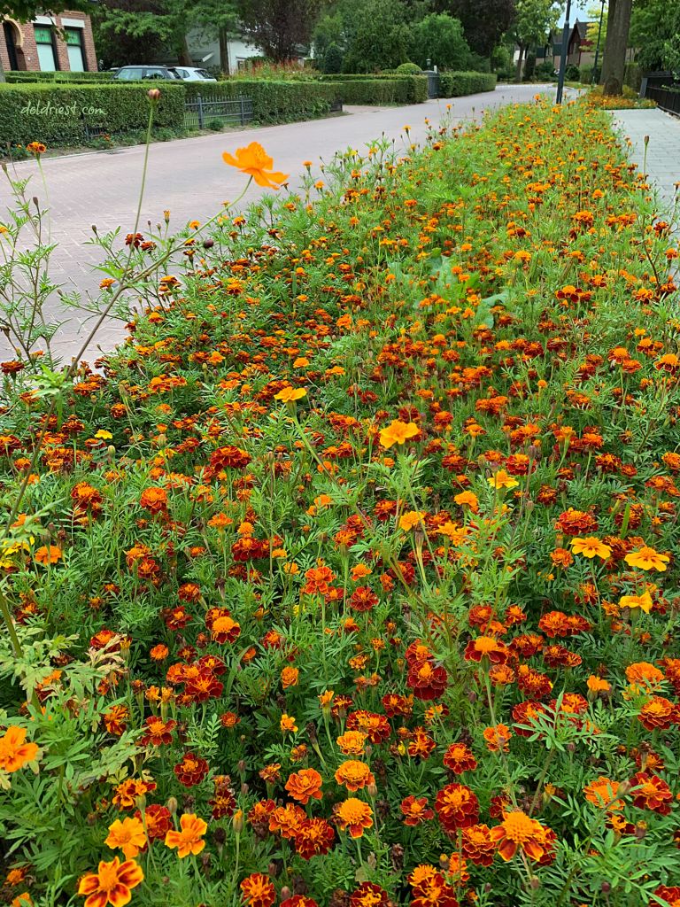 Een zee van vrolijke kleuren strekt zich uit langs de weg.