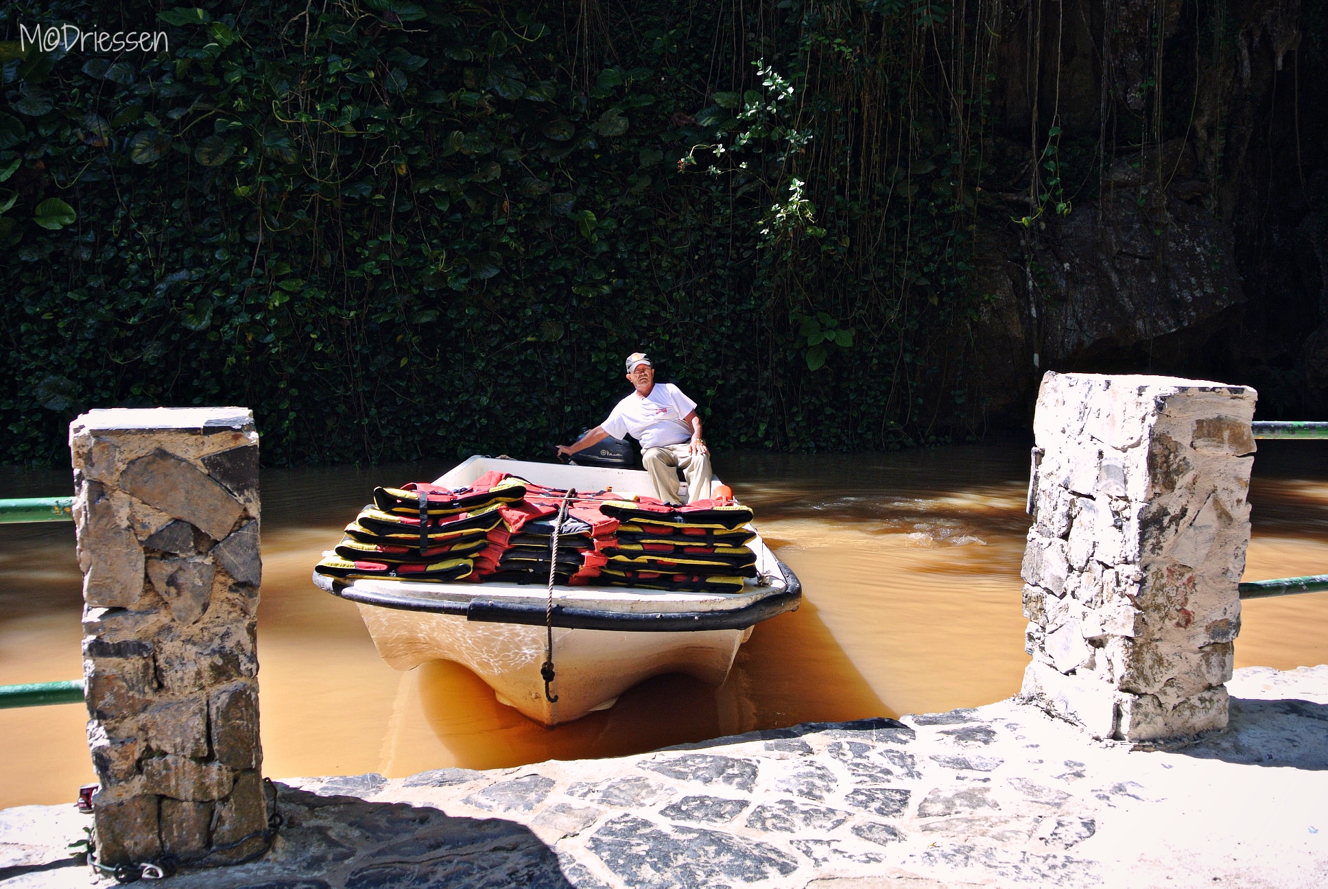 Wij rijden naar de Cuevas del Indio en betalen 2 CUC (ongeveer twee euro) voor het parkeren van de auto. Een plattegrond is niet nodig: we volgen het paadje en laten daarbij de nepindiaan links liggen. Hij is bezig met wat huiden geloof ik, maar er is in de verste verte niets te zien dat met indianen te maken heeft. Een trapje leidt ons de donkere, vochtige krochten der aarde in. Hoe die ruimtes en vormen door water uitgeslepen zijn is onvoorstelbaar. Wat is Moeder Aarde geduldig. Op een bepaald punt wordt het nauw en laag, mijn rugzak blijft er zowat hangen en mijn waterfles schuurt langs de rotswand. Claustrofobische gedachten klauwen zich een weg naar boven, maar ik druk ze snel weer weg en we komen veilig bij de boten aan. De tocht over het water is heel kort maar wel mooi.