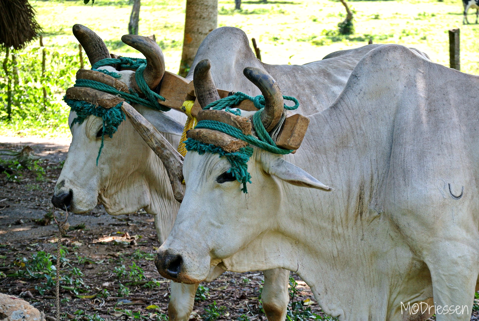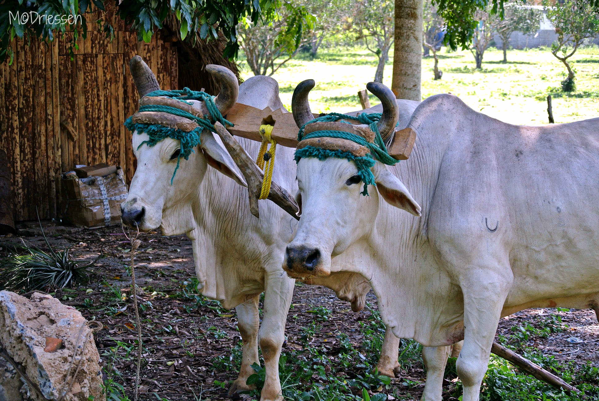Ossen dragen gelaten hun juk en sleuren de vracht vooruit, langzaam maar zeker. Ze moeten bijzonder goede maatjes zijn. Of het kan ze allemaal niks meer schelen. Paardjes draven moedig met hooi, balen, zakken en mensen. Mannen zwaaien hun machetes en snoeien de struiken in strakke vorm. Het gras maakt plaats voor hun vaardige handen. Vrouwen lopen met paraplu’s om zich te beschermen tegen de altijd aanwezige zon. In de berm houden verkopers twee stuks fruit omhoog. Misschien staan ze er vanmiddag nog. Een oude man met een stok strompelt een helling omlaag, een plastic zak in zijn hand. In de verste verte geen dorp te bekennen langs deze kronkelende CC weg vol onverwachte kuilen. V-man moet constant opletten dat hij ze ontwijkt.