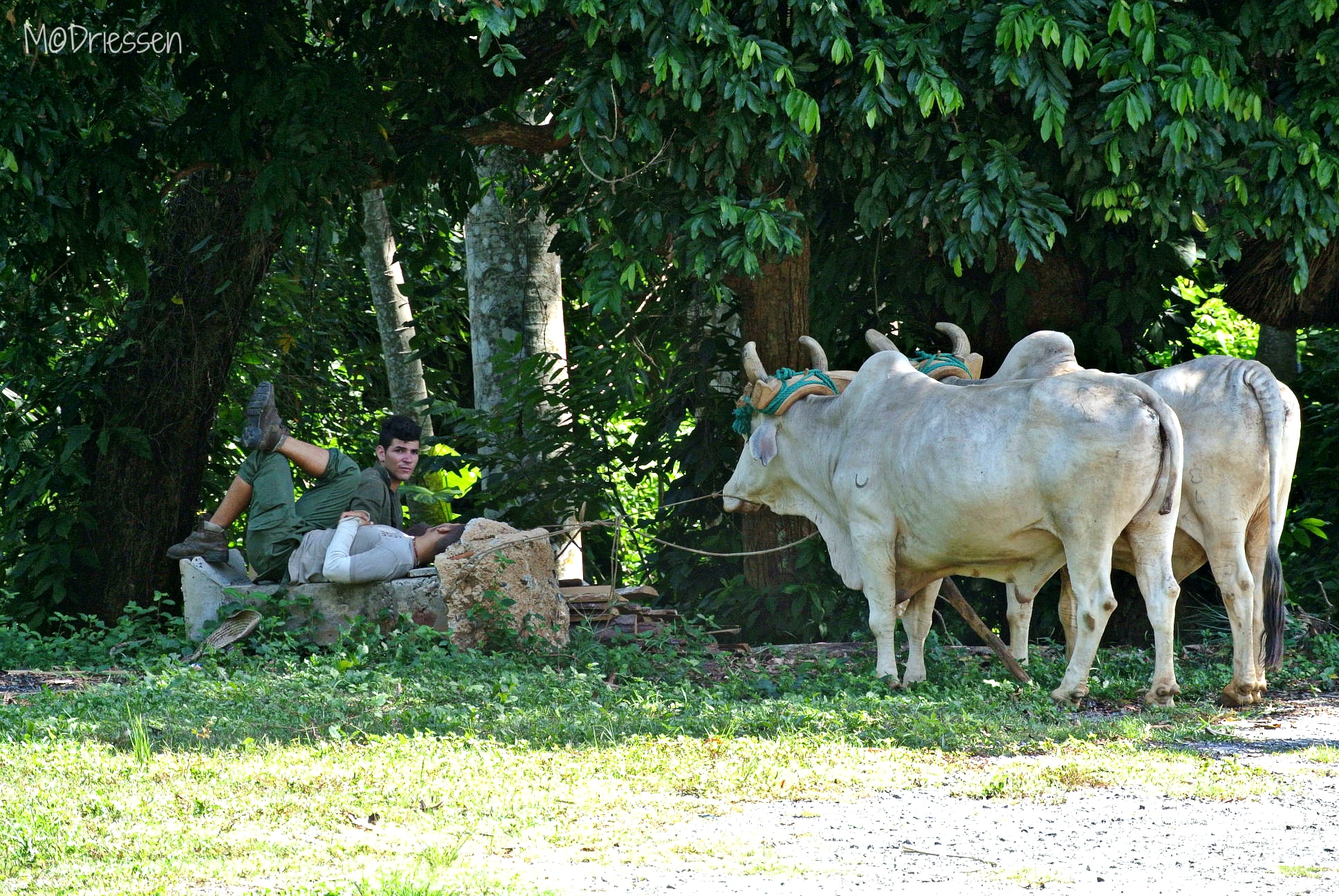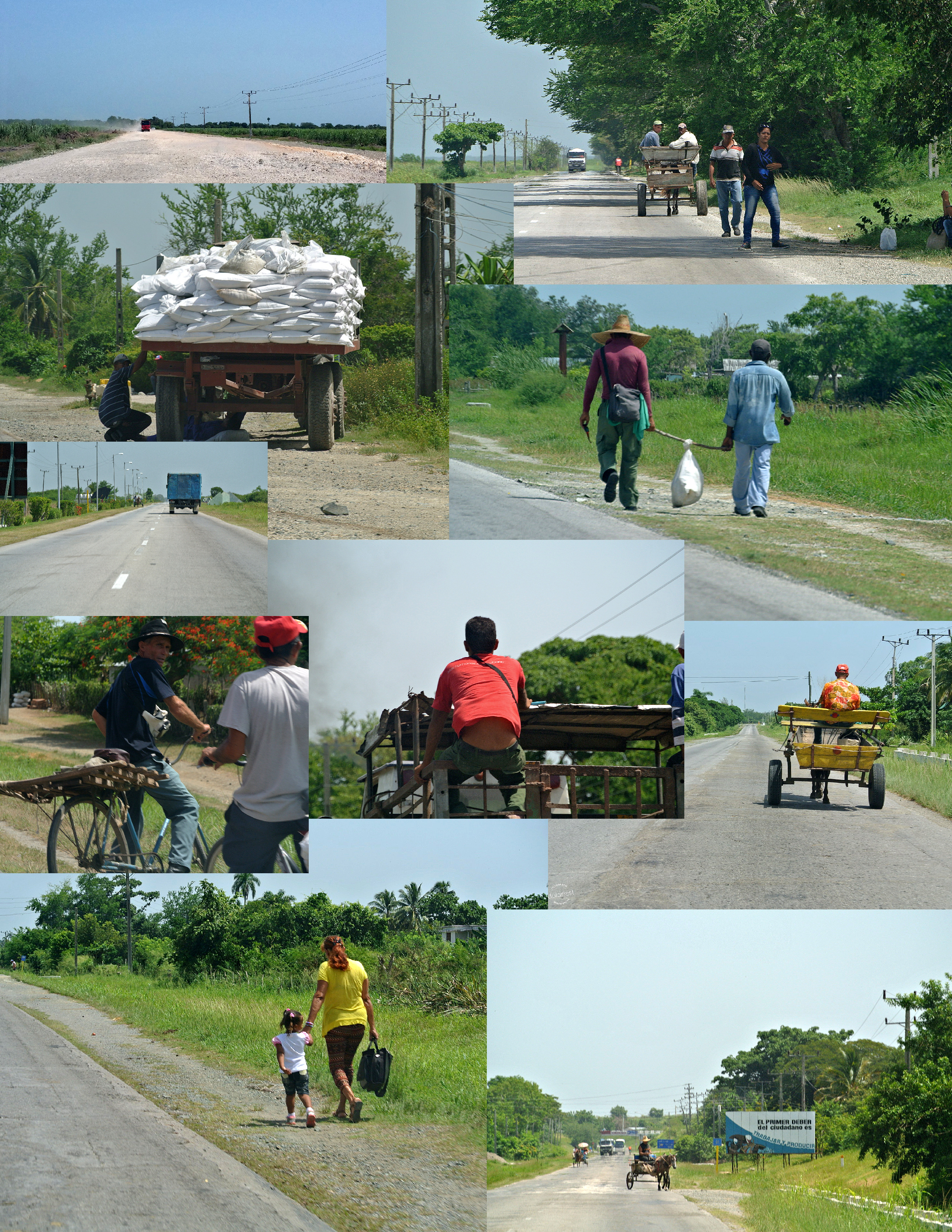 Twee mannen zitten op hun hurken in de schaduw van een boom. Hun rubberlaarzen zijn helemaal in in Cuba. En als je echt hip wilt zijn, trek je daarbij ook nog je shirt omhoog over je buik. Geitenhoeders en Cubaanse schonen lopen langs de weg. Waarschijnlijk urenlang, want waar gaan ze heen? Er is niets. Auto’s repareren is een sociale aangelegenheid. Met zijn vijven rond de motorkap. Je moet wel verstand van auto’s hebben als je hier woont. De vehikels zijn zo vaak gerepareerd dat alles versleten is. Verkeersborden zijn vaak met de hand gemaakt. ‘Paard en wagen’ lijkt meer op een hond met een wormvormig aanhangsel.