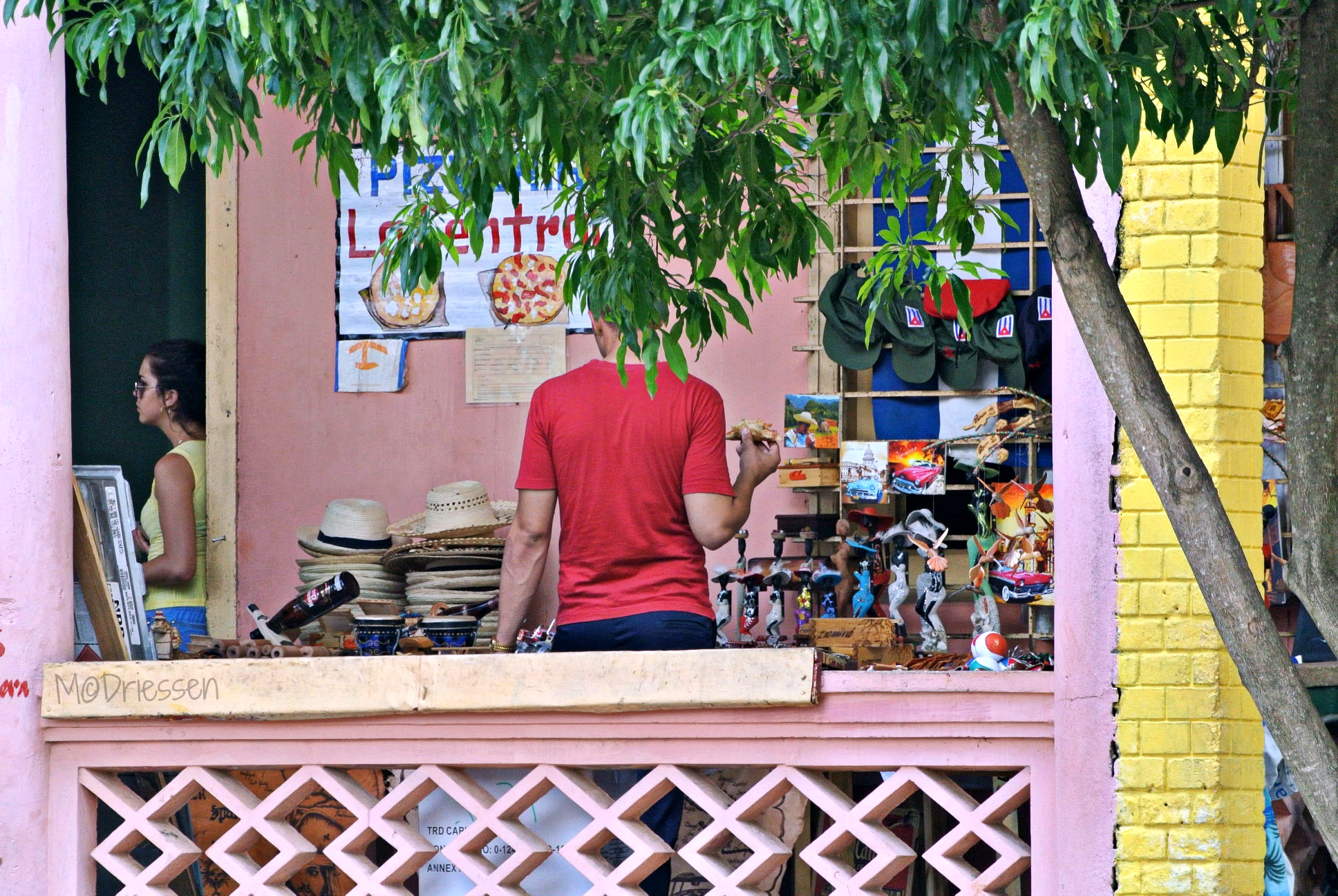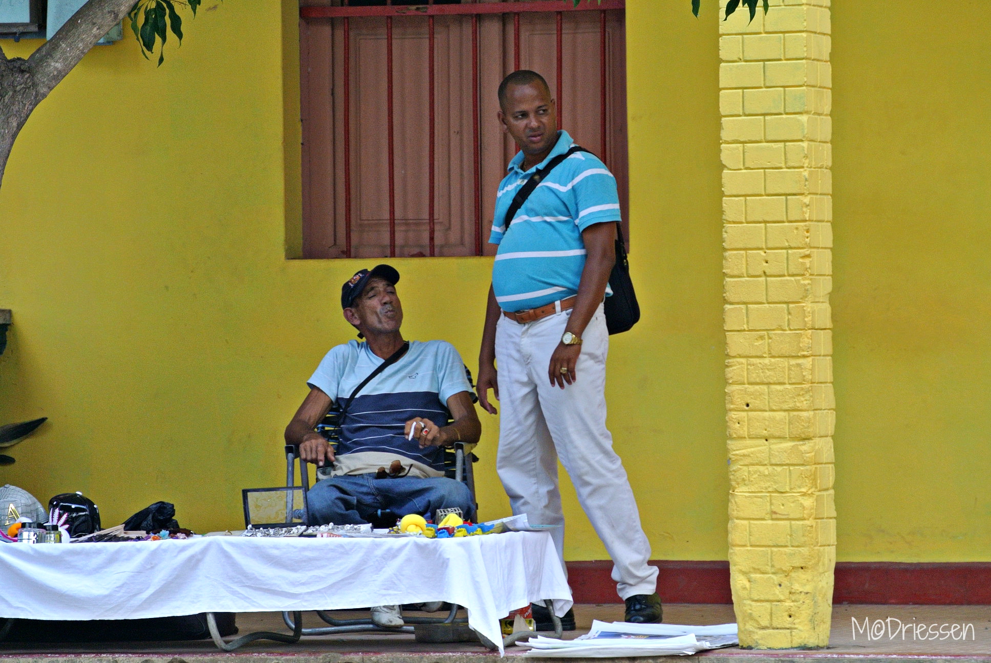 Een oude man zit langs de kant van de weg met een haan op zijn strohoed. Foto maken, vraagt hij? Ik lach en bedank. Ze willen alleen maar geld. En ik had een goede leermeesteres in de sigarenrokende vrouw in Havana. Op een marktje worden gehaakte katoenen shirts te koop aangeboden. Schilderijen van Cubaanse auto’s, Che Guevara, Fidel. Houten maskers. Verkopers schieten toe uit alle hoeken en gaten om hun waren aan te prijzen. Alles is verleidelijk in de zon.