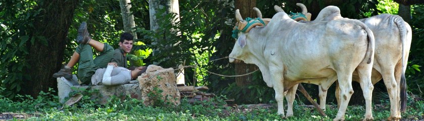 We rijden al drieënhalf uur en zijn nog lang niet op de helft van de route naar Sancti Spiritus. Een motorrijder rijdt dwingend naar ons toe en dirigeert ons de berm in. Achter hem nadert een volgeladen tientonner in volle vaart. Sjesus! De lange rit is bijzonder slaapverwekkend en ik vecht om wakker te blijven om Victor gezelschap te houden. Tot ineens een cowboy zwaait met zijn hoed en ons tot stoppen dwingt. Links en rechts een kudde koeien, zes man te paard eromheen. Geweldig, ineens ben ik klaarwakker. Ik wil het filmen! Maar we zijn alweer voorbij.