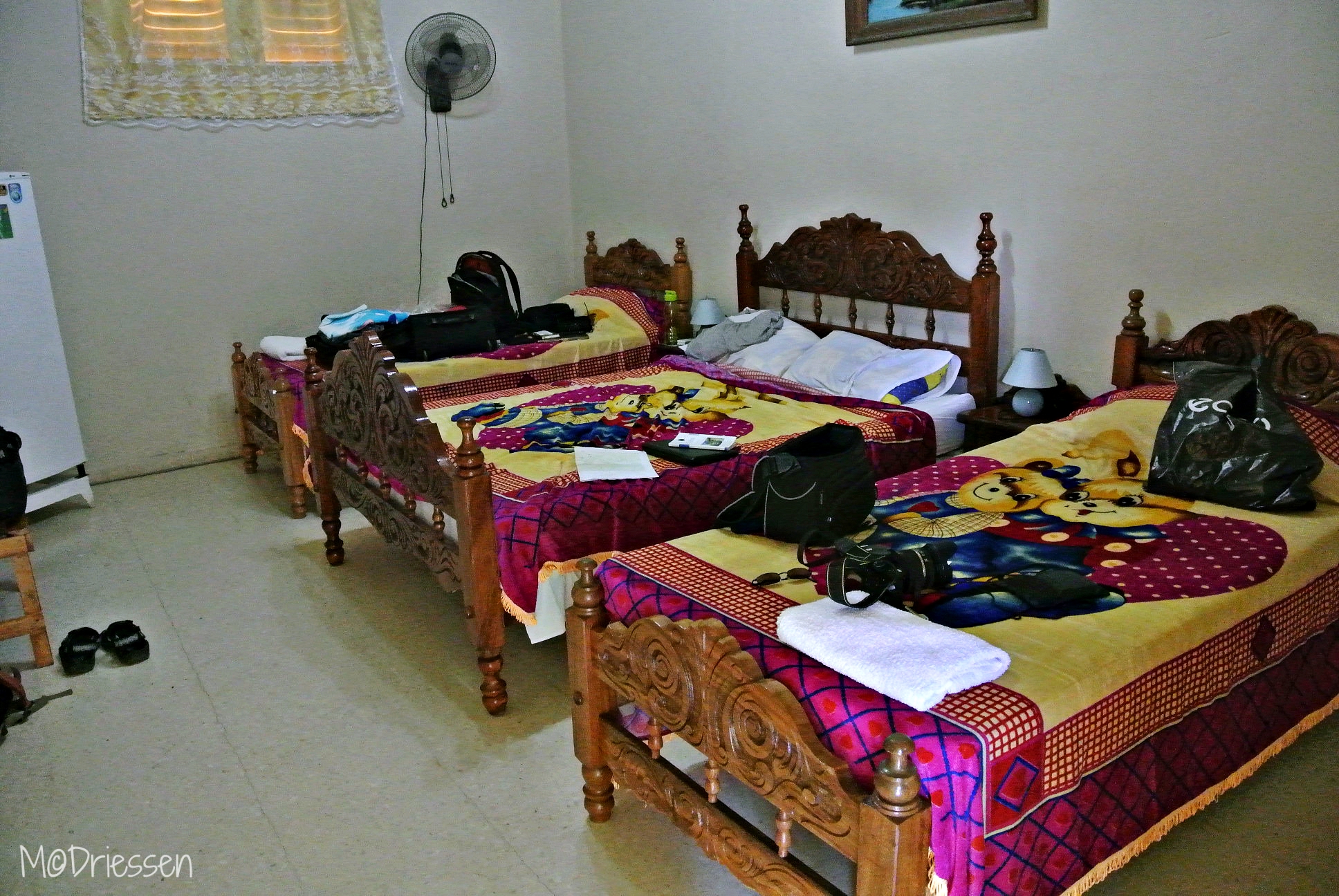 Dit keer wekt de voucher van ons reisbureau verwarring, want het adres komt niet overeen met het kaartje dat erbij zit. Eerst maar eens naar het adres rijden. We hobbelen over de kasseien en komen aan in de juiste straat met aan weerskanten pastelkleurige huisjes. Een oude man komt moeizaam overeind als we de auto parkeren. Hablas Español? Nee, alleen un poco. We begrijpen dat hij op onze auto zal passen, terwijl wij onze hostel zoeken. De man wordt bijgestaan door een stotterende jongeman, en in optocht lopen we door de smalle straat. Bij het juiste huisnummer hoort een dichte groene deur. Geen bordje, geen casa of hostel, helemaal niets. Alleen die dichte deur. Inmiddels worden beide buurmannen gealarmeerd en komt nog een vijfde man ‘helpen’. Amigos, zegt hij, en bonkt op de deur, die nog steeds van geen wijken weet. Mijn rugzak wordt steeds zwaarder en mijn shirt is doordrenkt. De buurman aan de rechterkant grijpt zijn telefoon en gaat bellen. Dan komt hij triomfantelijk naar ons toe en vertelt dat we ergens anders moeten zijn. Ja hoor, naar de locatie die op het kaartje wordt aangegeven; het adres klopt niet meer. We danken alle mannen uitbundig, geven de oude heer wat geld en stappen weer de auto in.