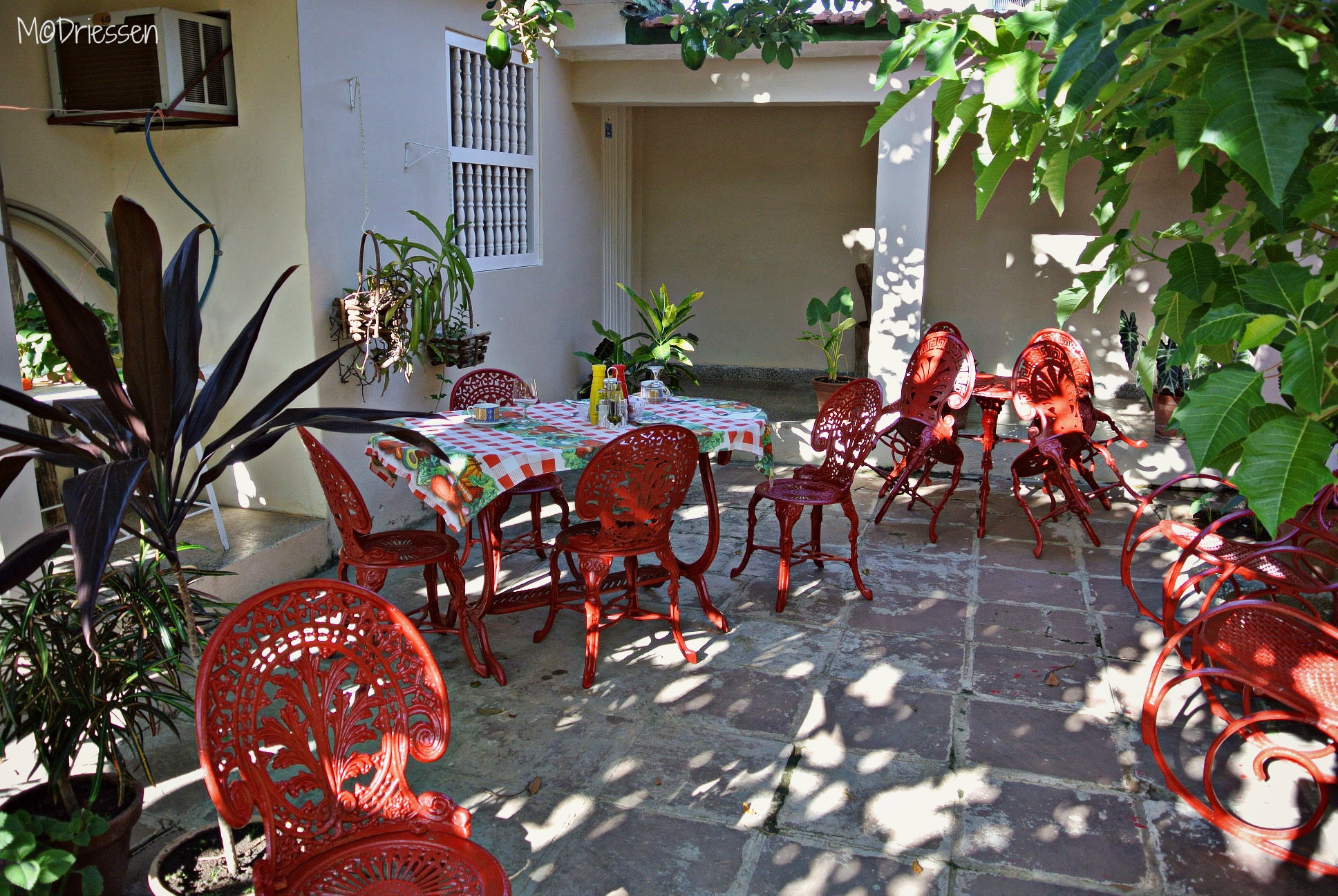 Eduardo brengt ons met de auto naar de welbekende groene deur volgens het adres op de voucher, gaat zelf op onderzoek uit en even later rijden we weer naar de wegversperring van die middag. Hij is gelukkig in Trinidad opgegroeid en kent iedereen. Met zijn hulp mogen we toch doorrijden – het autovrije centrum in – en binnen drie minuten staan we voor een andere anonieme deur, maar dit keer wel de goede: de hostel van Doña Chefa. Wat ben ik opgelucht! Drie generaties vrouwen wachten ons op en niemand spreekt Engels. Onze lieve gids legt alles in het Spaans uit en na veel oh’s en ah’s worden we dan eindelijk naar de voor ons gereserveerde kamer gebracht. En er is niks mis met het toilet. Een gezellige kamer in gele kleuren aan een droom van een binnenplaats. Ik voel me meteen thuis.