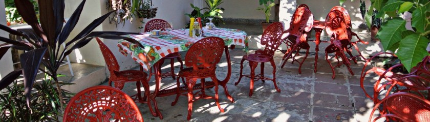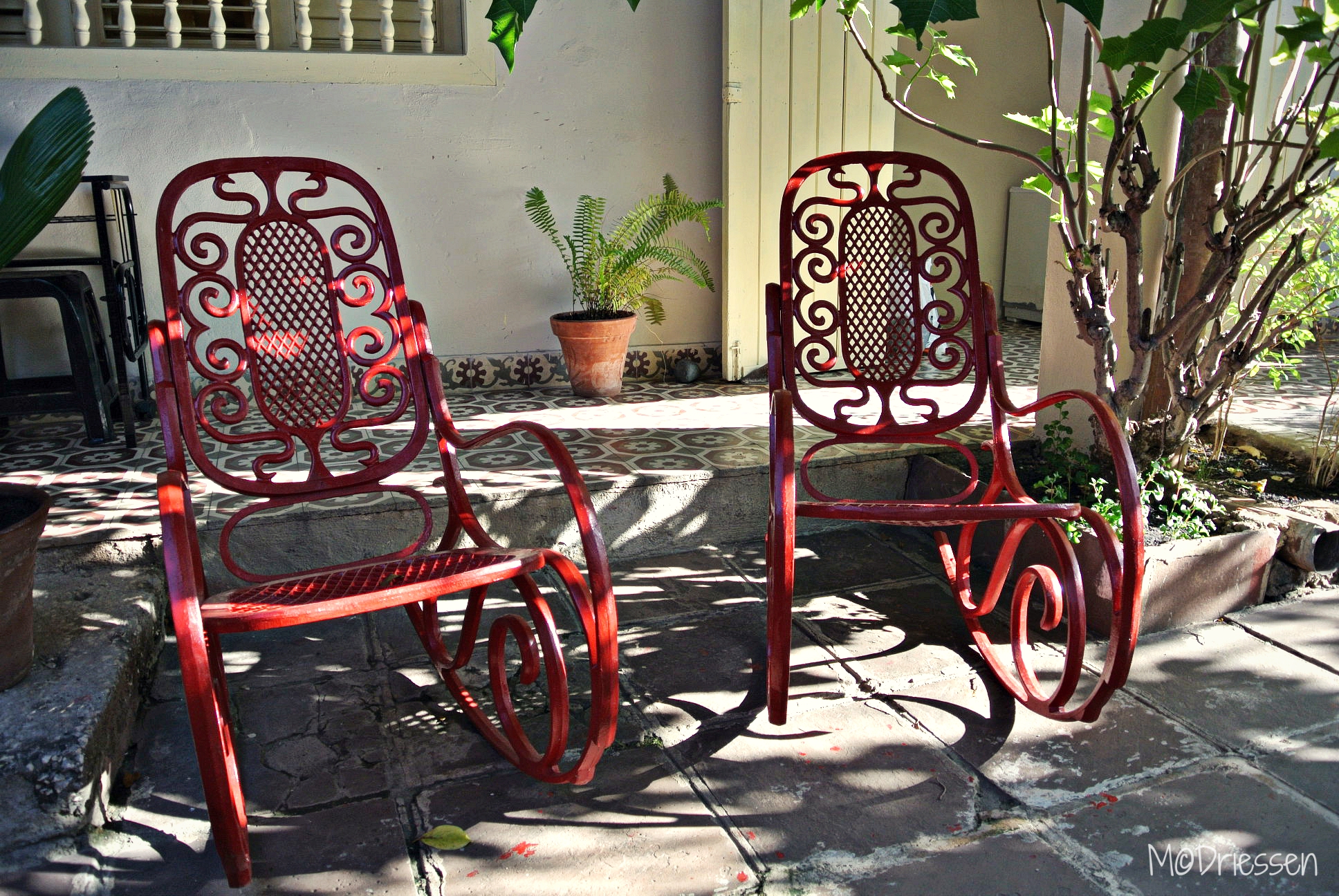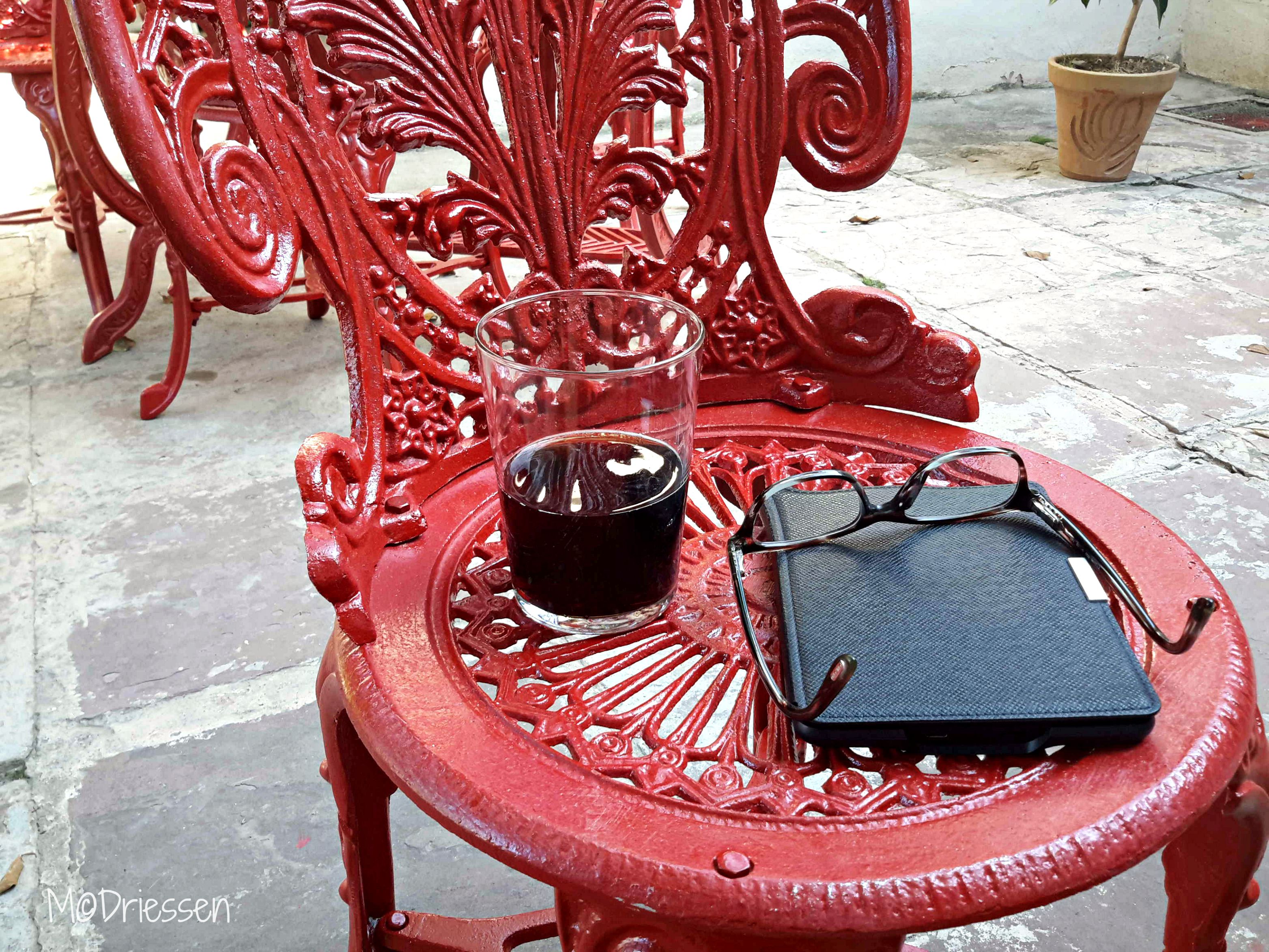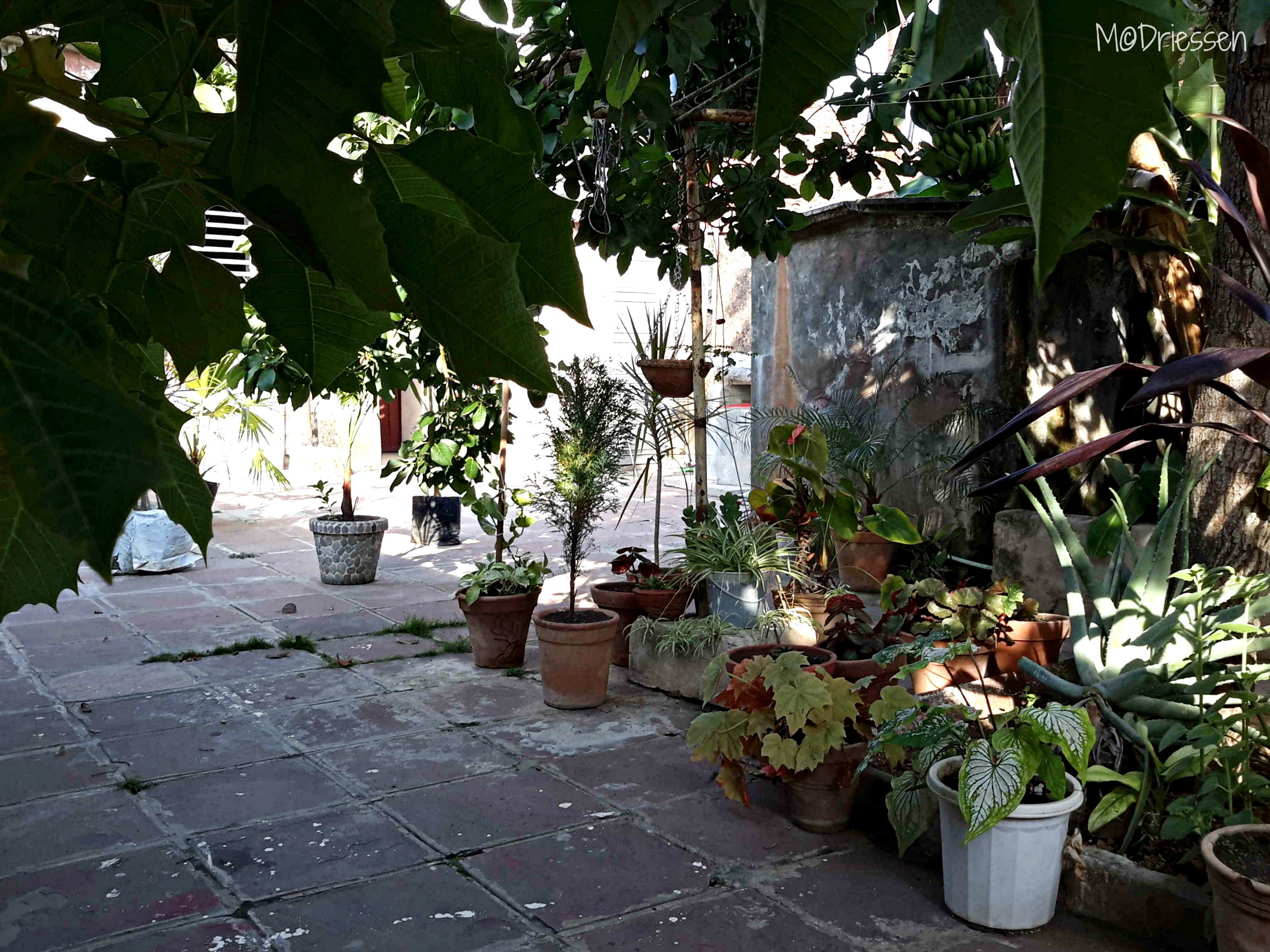 Het is goed vertoeven in de beschaduwde achtertuin. Onze was hangt te drogen op de binnenplaats; Oma is druk in de weer geweest. Het rode gietijzer van de meubels contrasteert prachtig met de vele groene planten. Een hagedisje staat met de voorpootjes op de rand van de bloempot en besluit de sprong te wagen. Zonnebaden met zijn staart omhoog. Musjes vechten om een paar broodkruimels. Op de straat horen we karren voorbij piepen, hobbelend over de ongelijke stenen.