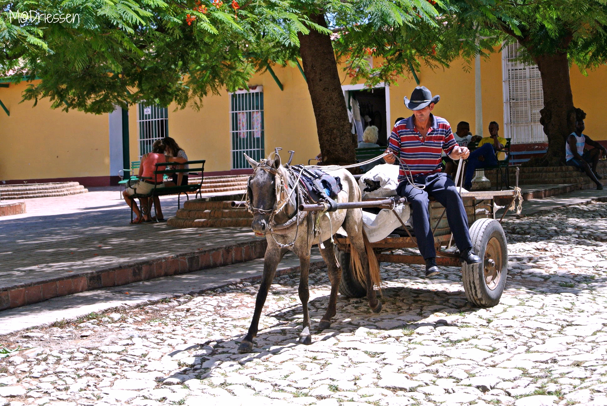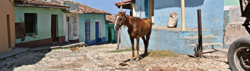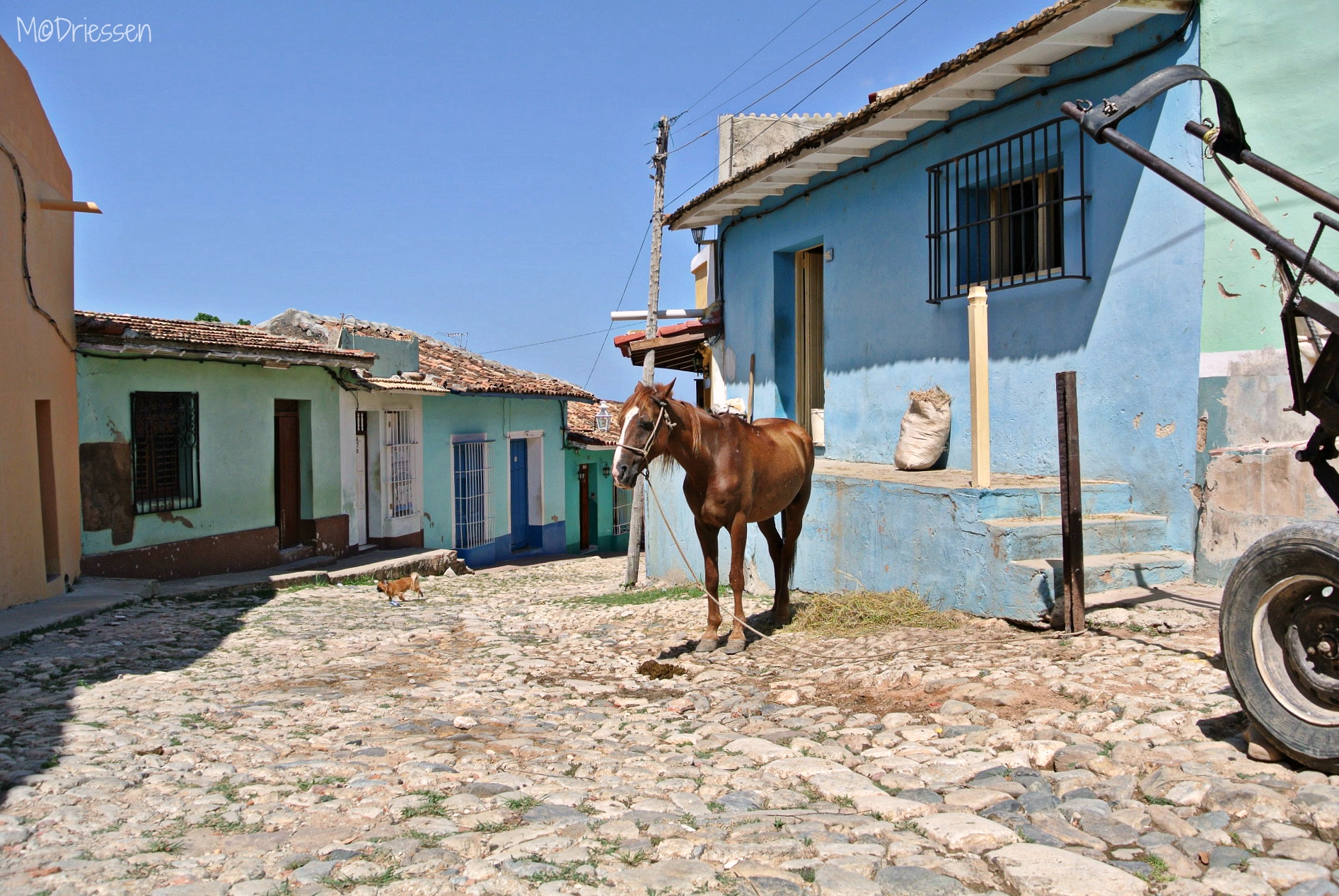 Paarden staan geduldig te wachten tot hun meesters de kar hebben volgeladen. Cigar, Cuban cigar? No thanks. We lopen verder, het paardje achterlatend in de schaduw. Een vriendelijke hond zit te kwispelen op de stoep, haar baasje binnen voor het getraliede raam. Gelukkig staat de deur wel open, ze zit niet opgesloten. Ik raak met haar aan de praat en laat de hond aan mijn hand snuffelen. Een vlugge aai – eigenlijk mag ik dit niet omdat ik niet ingeënt ben tegen hondsdolheid, maar deze lieverd kan ik niet weerstaan – en verder gaat het weer.