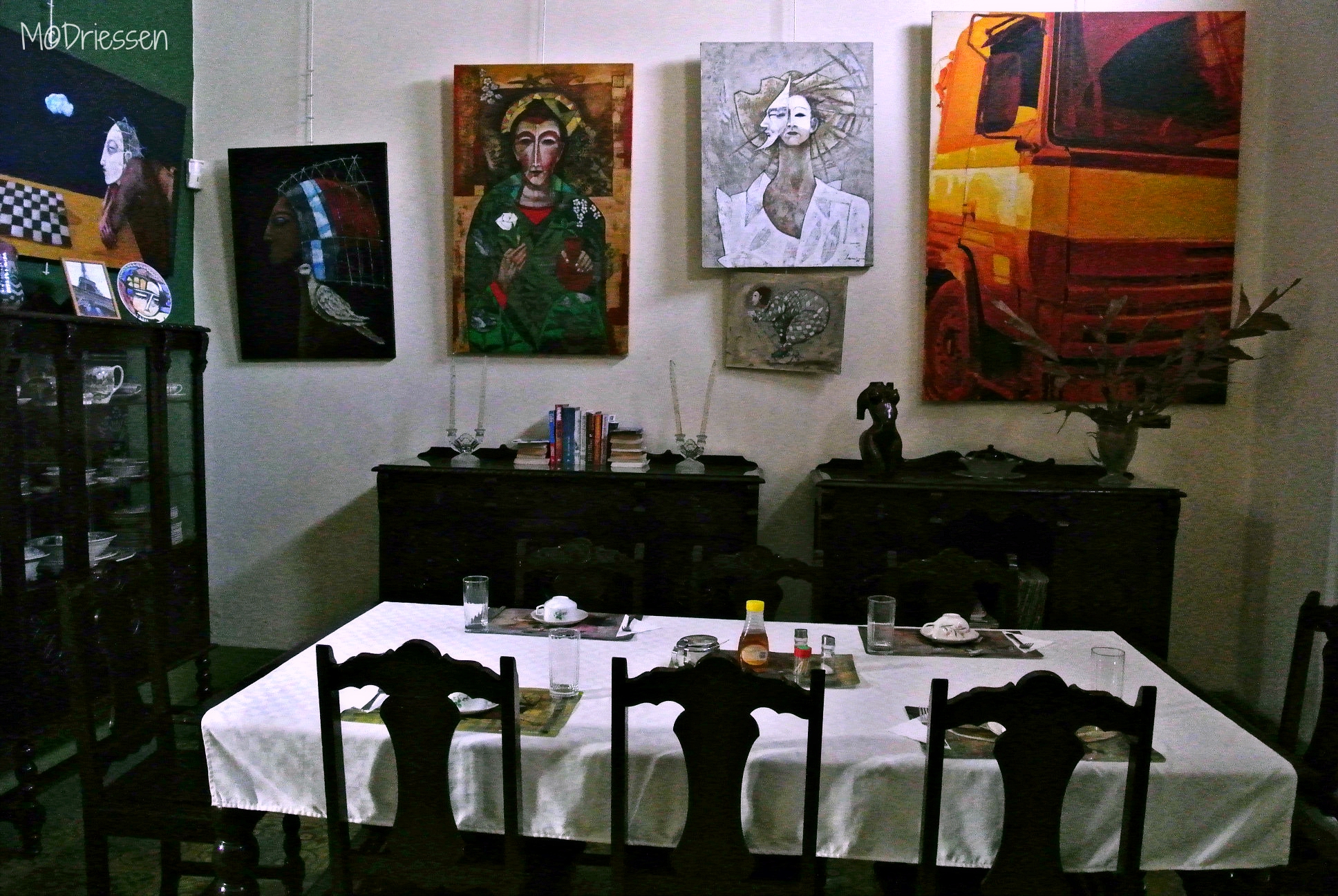 ’s Avonds eten we echt Cubaans bij de familie, gezellig samen met Tanja en Hans. Kip, rijst, avocado, wat boontjes en mango (jawel, de mango’s die we eerder die dag van Eduardo kregen), de tafel staat vol. De eetkamer is – net als onze eigen kamer – heel erg hoog, en hangt vol met kunst. Het zijn kunstclowns. Overal kijken clowns op ons neer. Dat vind ik persoonlijk wat minder, want ik vertrouw ze voor geen cent. Maar het het effect is chic en artistiek. We spreken af dat we om 8 uur ontbijten. In tegenstelling tot wat onze Gebroeders Tweewieler zeiden, is het helemaal niet moeilijk om uit Camaguey weg te komen, vertelt Alejandro: met de koffers naar de auto lopen, het parkeerterrein af en dan naar links afslaan; alsmaar rechtdoor tot Las Tunas en daarna rechts aanhouden. Verder is het een lange weg naar Santiago de Cuba. Waar het zo ongeveer 45ºC is. OMG. Probeer dan maar eens het hoofd koel te houden.