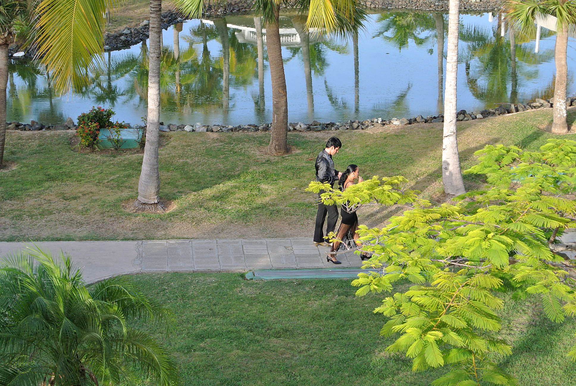 ’s Avonds gaan we naar het restaurant waar een zeer uitgebreid buffet staat. Bedenk maar iets, en het is er. Behalve de sojayoghurt waar ik zo’n zin in en behoefte aan heb. Behalve thee. Blijkbaar hoort dat alleen maar bij het ontbijt. Ik schep een beetje rijstsalade op met erwtjes en mais, en eet twee bananen. Oh yes, all inclusive! 😉 Drie glazen mineraalwater brengen de vochthuishouding weer een beetje op peil en we sluiten de dag af met een romantische wandeling over het terrein. Een kus op een bruggetje in het licht van de maan. Cuba by night. Sleep well.