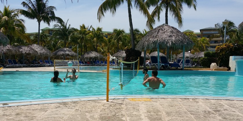 Rond het middaguur gaan we aan het zwembad liggen onder een tropische parasol, gemaakt van palmbladeren. Victor gaat zwemmen en ik hang met mijn neus boven de ereader. En we hebben geluk, want het is Sabado Dia Cubano vandaag, Cuban Day. Een deel van het terrein is omgetoverd in countryside style. De lunch wordt buiten opgediend, waar we ook nog getrakteerd worden op een dansvoorstelling. Er is vers geroosterde vis, barbecue en een speenvarken. In exotische geuren, kleuren, klanken en met veel souplesse komt Cuba tot leven.
