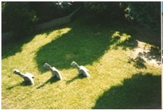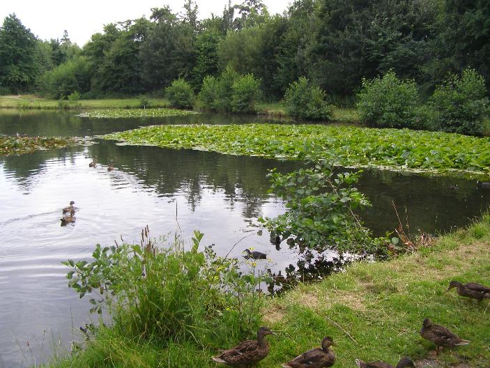Het werd nog erger toen Dasso de eenden in de vijver zag. Met een – dat moet ik toegeven – pracht van een sprong verdween hij onder water om vlak bij de eenden weer op te duiken. De eenden vlogen al kwetterend het luchtruim in, Dasso verrast in het water achterlatend. Door het almaar luider wordende lachen van de ‘Heren Jagers’ was mijn geduld tot het nulpunt gedaald. In mijn woede pakte ik een grote steen – die lagen daar in overvloed – om, zodra hij uit het water zou komen, mijn ongenoegen te laten blijken door de steen naar hem toe te werpen.