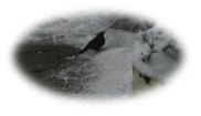 Een stelletje mussen probeert om bij het lekkers te komen, maar de merel houdt met verve zijn territorium vrij van ongewenste indringers. Dit aanschouwende duikt er plots een eksterpaar op waar ook mijn huismerel geen verweer tegen heeft. Ik sprint naar buiten om de merel bij te staan; dat is geen moeite voor mij en het strijdtoneel van voorheen is verdwenen.