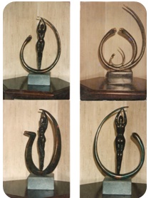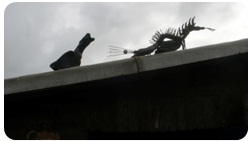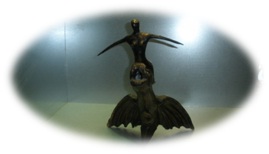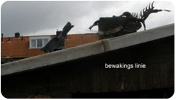 Verder zie je een draak die ontstaan is van wat afvalmaterialen, een regenton die ik wat kaal vond uitzien, een trechter gemaakt om wat bloemen in te zetten, een klok met een paar ogen erboven die waken over de juiste tijd, enkele bronzen beelden die ik gemaakt heb, en op de laatste foto zie je de wasmodellen klaarstaan om na enige verdere bewerkingen af te gieten in brons.