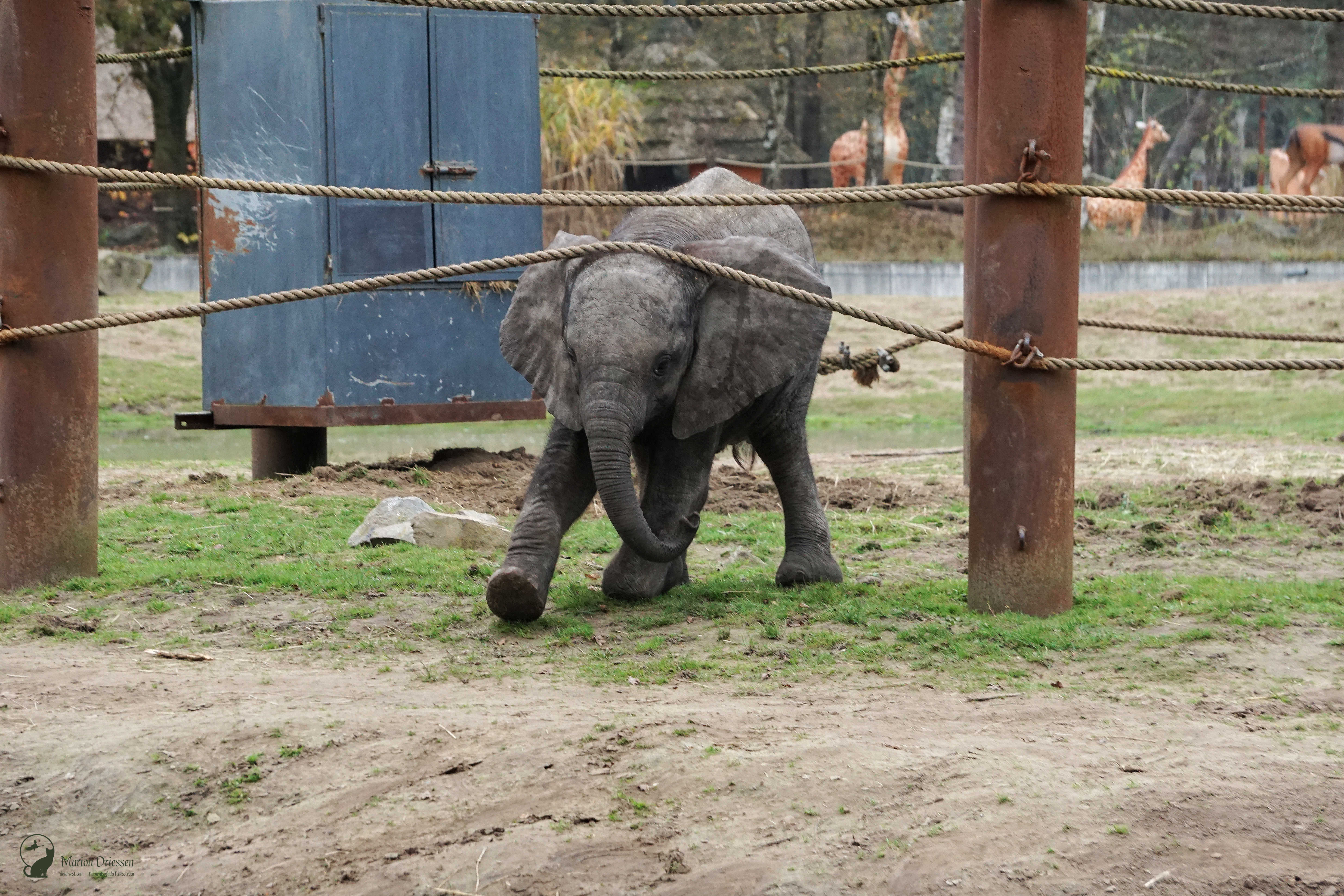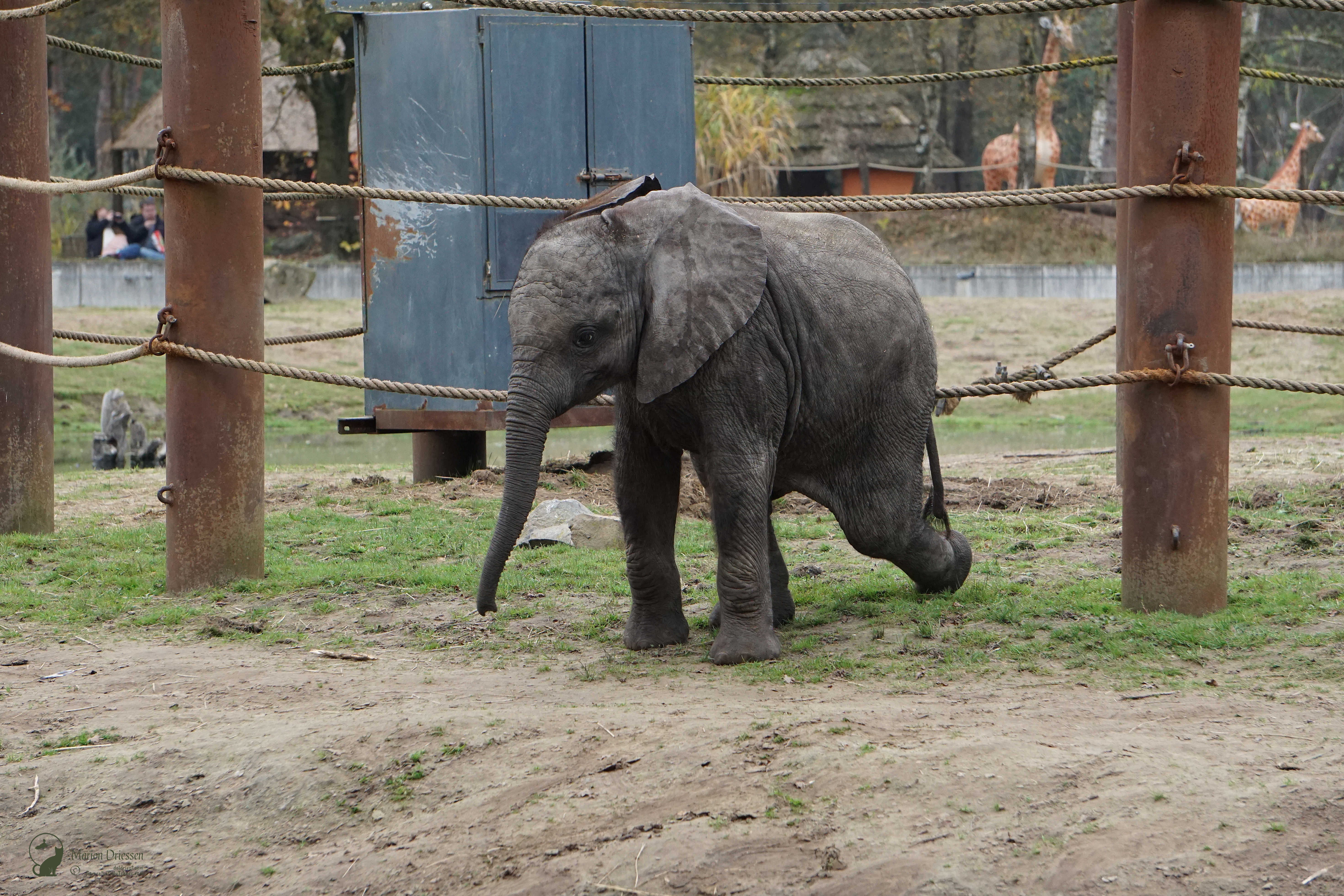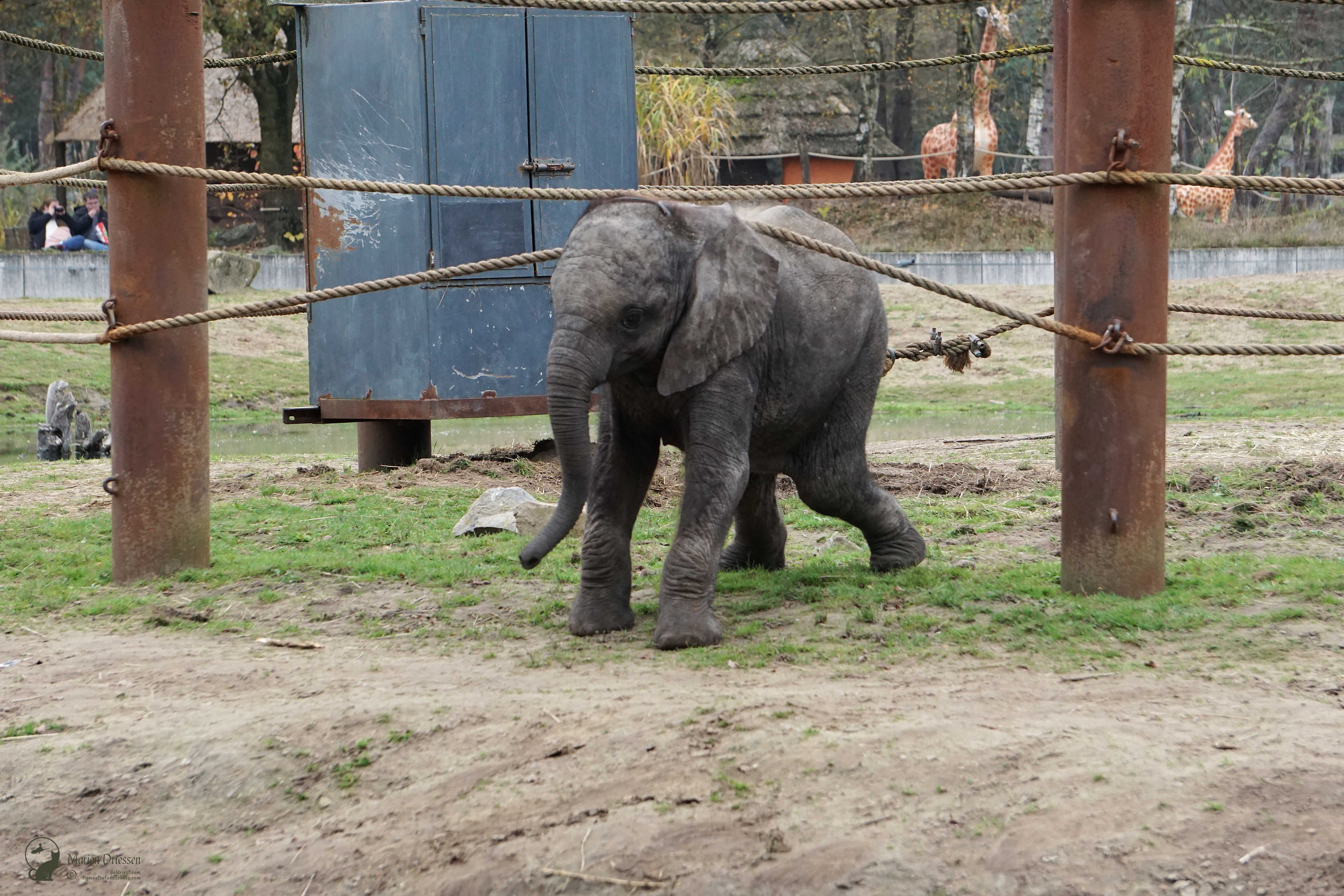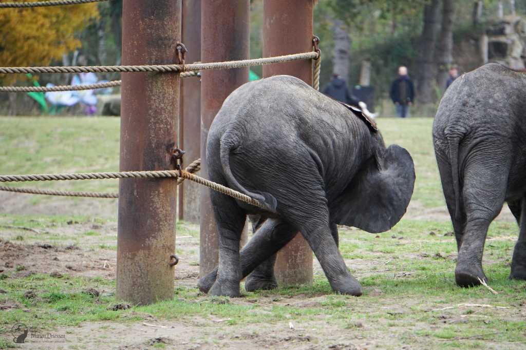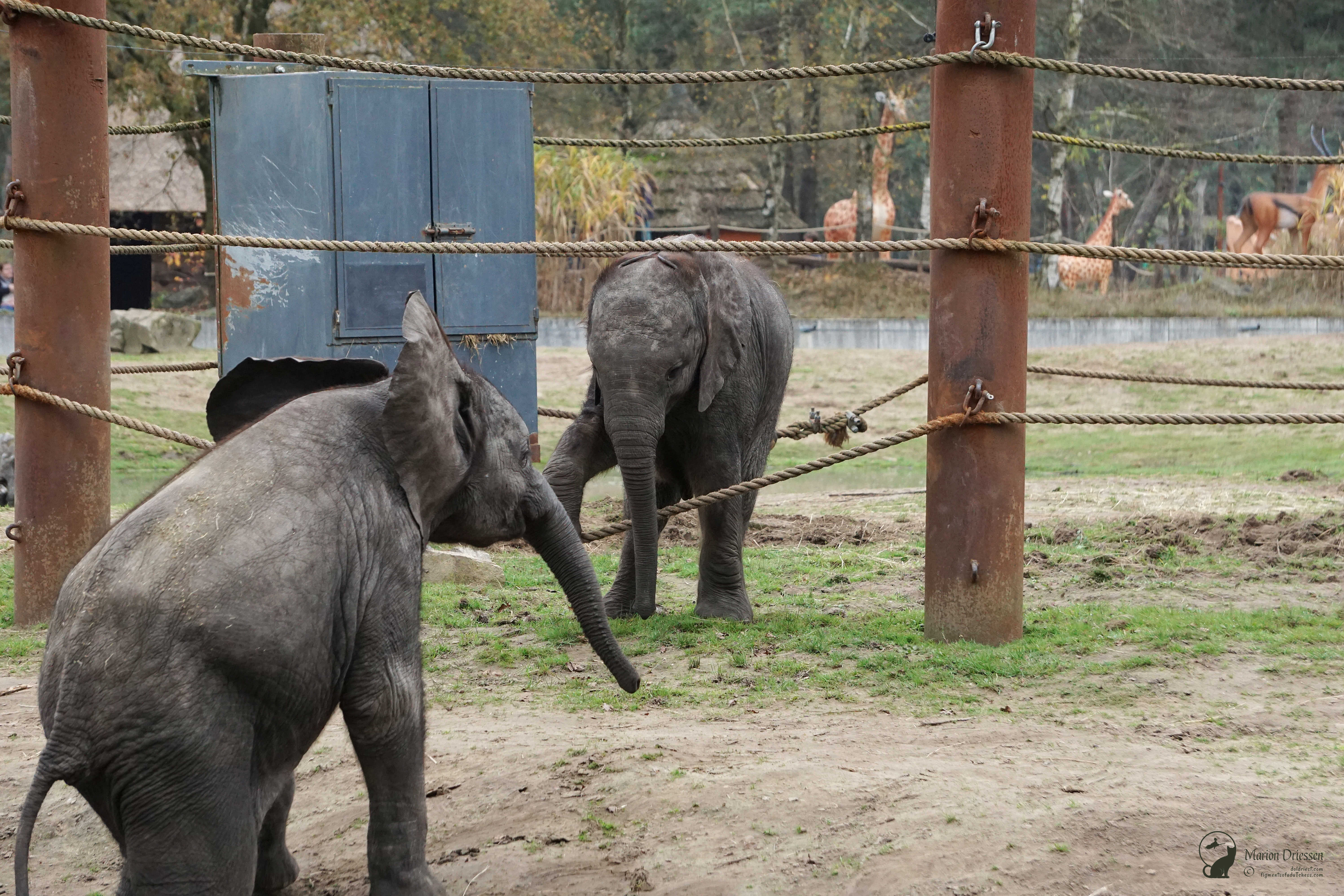 We waren bang dat de olifantjes al vroeg naar de stallen werden gebracht – het park sloot om half vijf – dus sjeesden we met gezwinde pas door het park terug naar de olifantenvlakte. En daar waren ze: Mosi, Ajabu en Tendai. ❤ De peuters speelden met en tussen de touwen, sleepten met takken en voerden schijngevechten uit. Olifantastisch! Ik bleef foto’s maken.