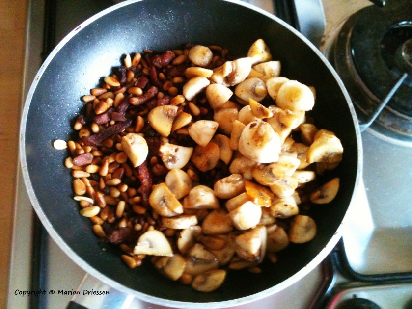 Pijnboompitten goudbruin en knapperig roosteren. Spek uitbakken, eruit scheppen en in het spekvet met wat olijfolie de champignons bakken.