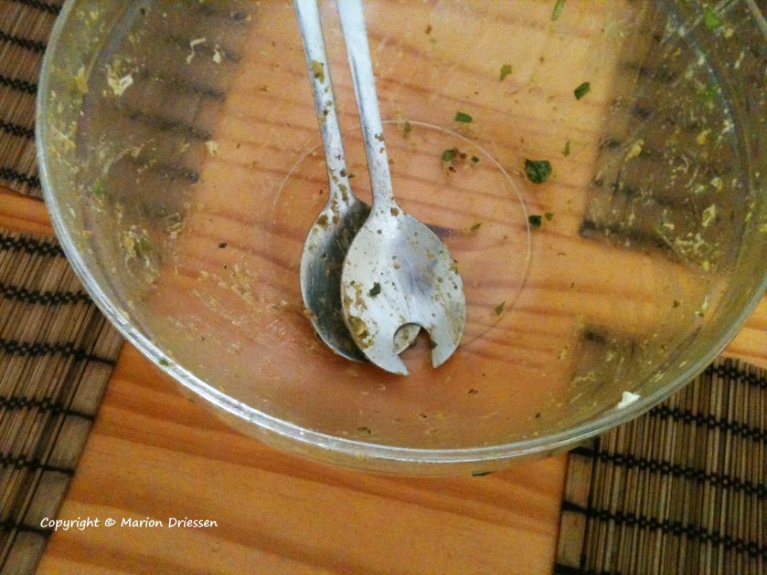 Alles samenvoegen in een grote kom (of twee). Voeg dan de verse basilicum,