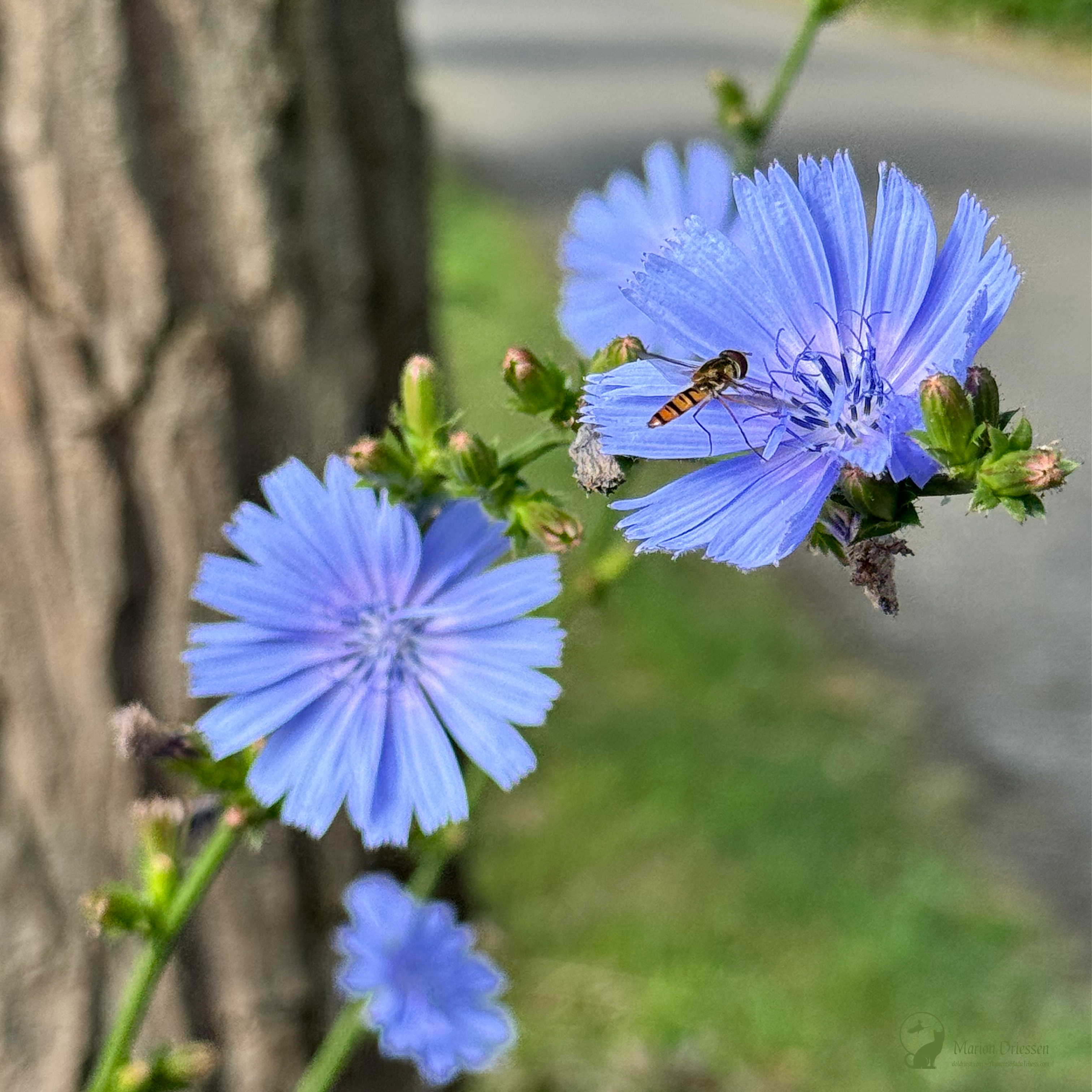 Deze wilde cichorei of zonnewervel wiegde aanlokkelijk langs de rand van de weg in de nog koele ochtendzon. Wat een hemelsblauwe pracht!