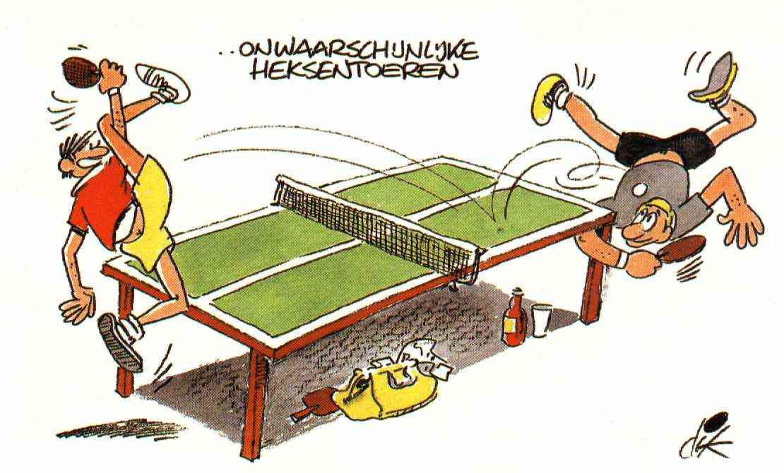 Tafeltennis was de volgende keuze. Redelijk stilstaan, niet al te gekke bewegingen en toch in teamverband. Plus ik was de enige vrouw tussen de mannen. Wat een zaligheid! Al gauw was de stilte voorbij en kreeg ik ze aan de praat. Vooral André was mijn maatje daar. We lagen regelmatig gierend en snikkend van het lachen over de tennistafel heen, wild naar balletjes maaiend. Ik heb er veel geleerd, maar het was toch niet goed voor die rug van mij. Na een half uur kon je een speld in mijn linkervoet prikken en ik zou het niet gevoeld hebben.